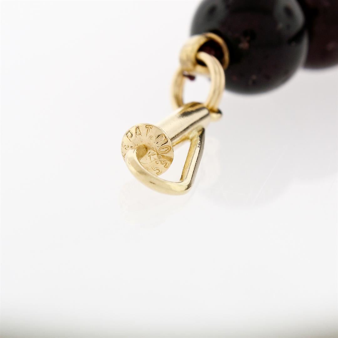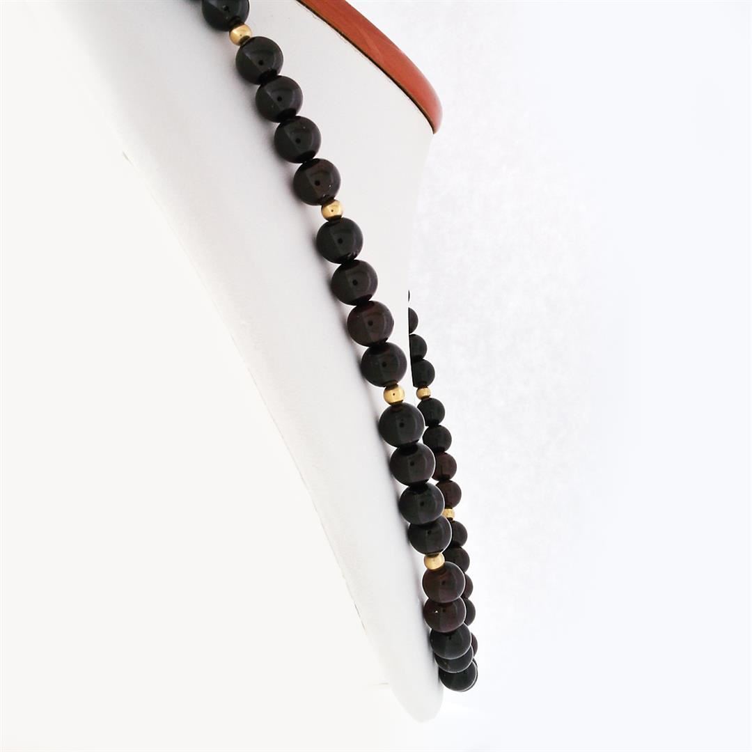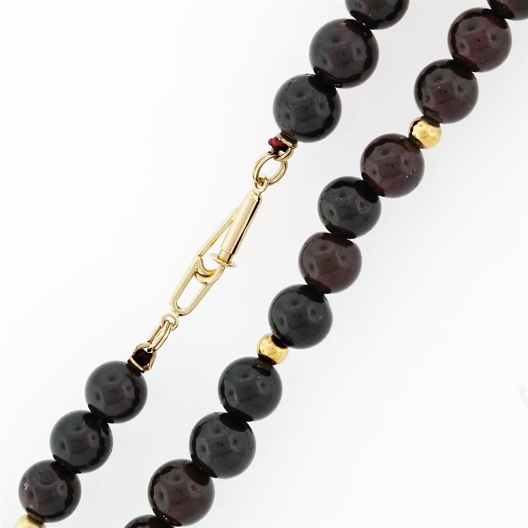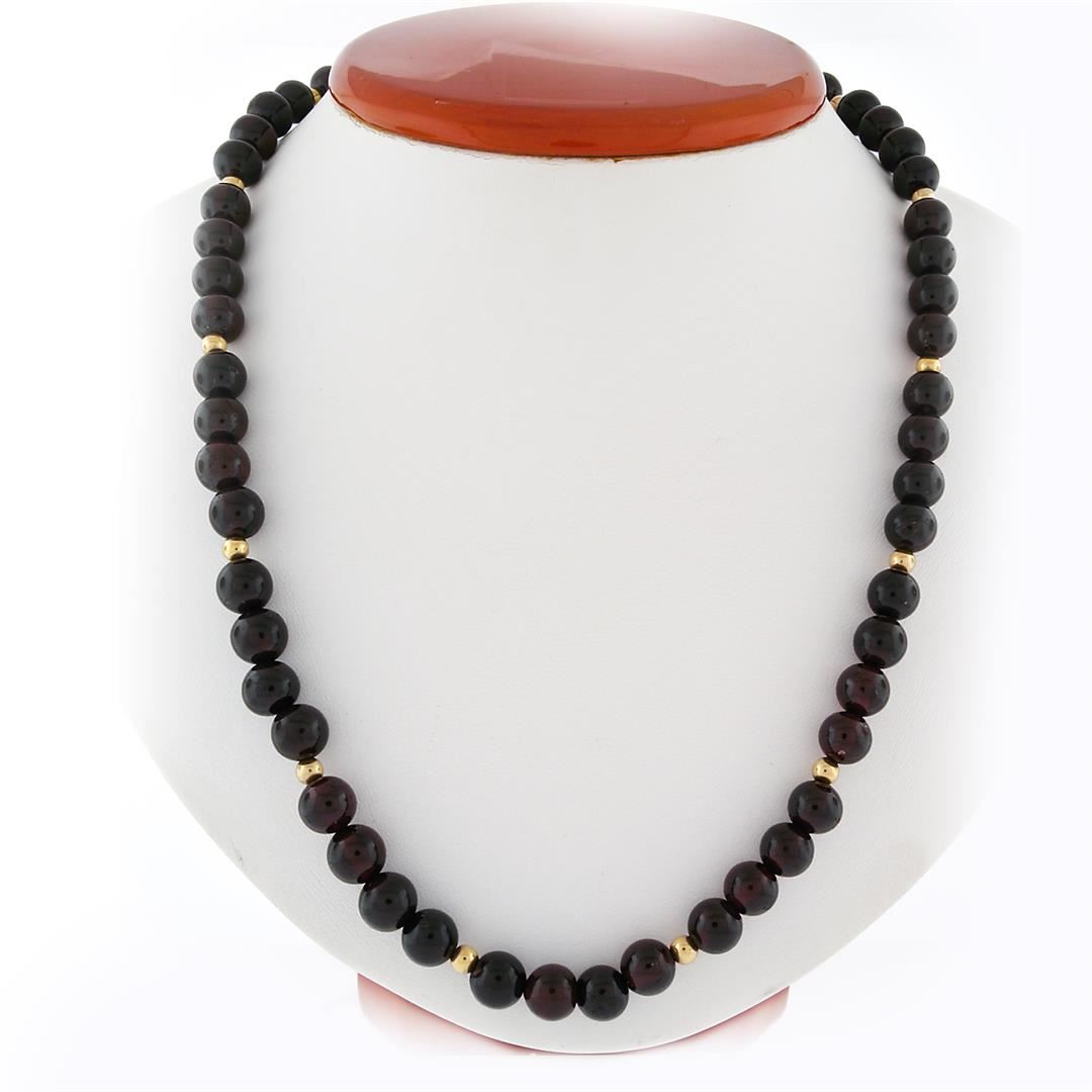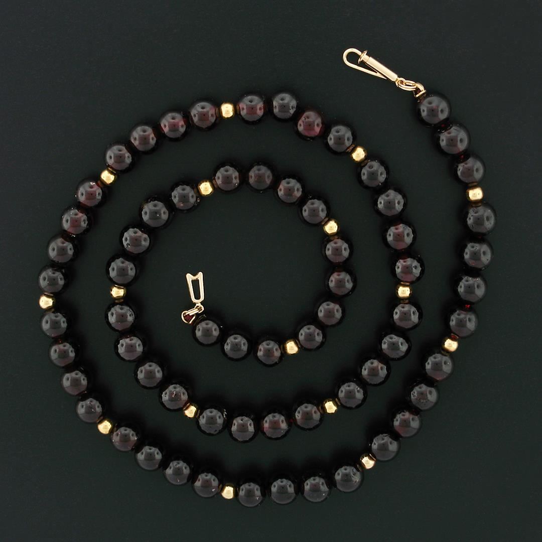 A vintage 14k yellow gold strand necklace with 66 round beads natural garnets (7.75 to 8.5mm) alternated with 16 round shape gold beads (3.9mm). 22 inch strand necklace, 72.76 grams total weight.