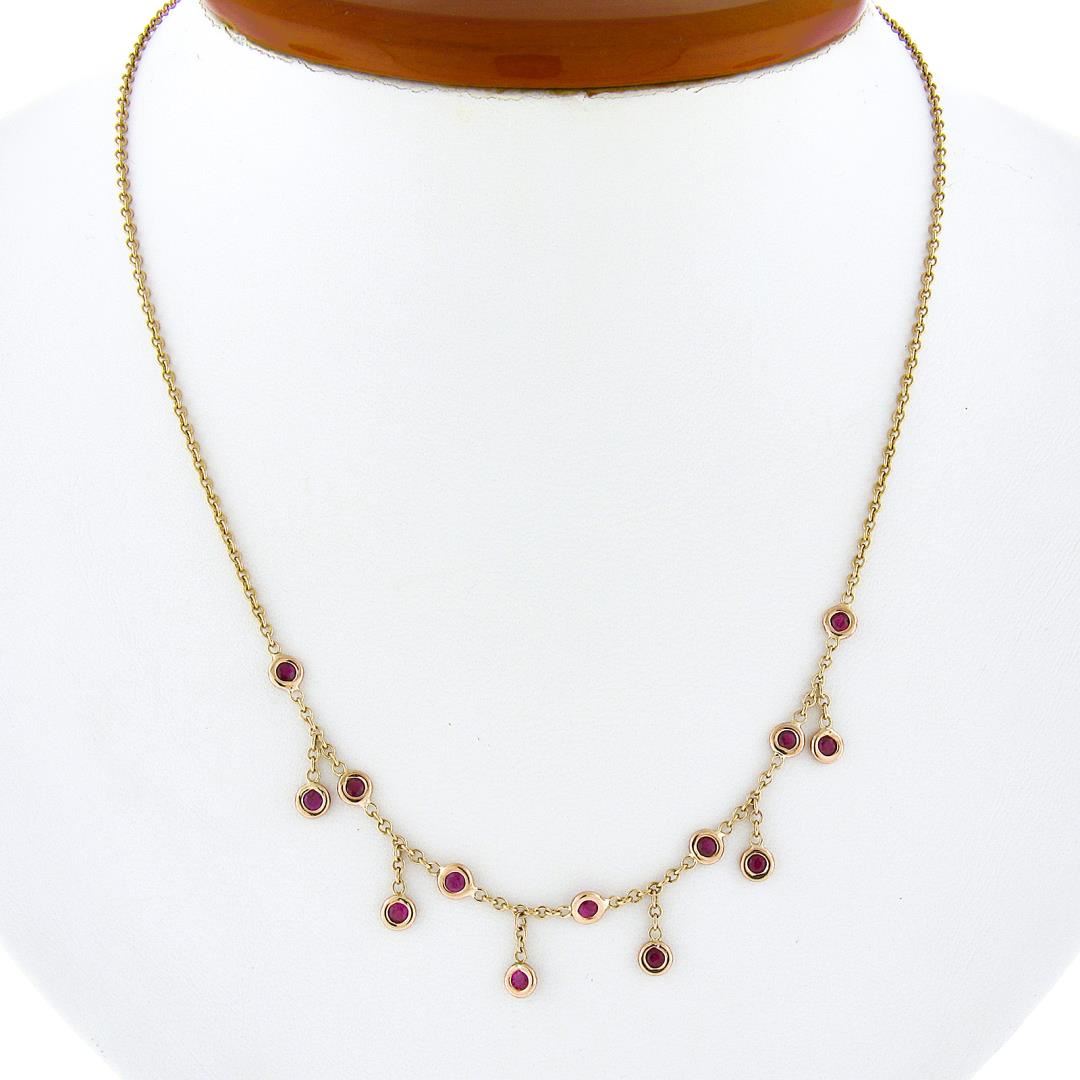 A solid 14k rose gold link necklace, with 13 round cut natural rubies (2.1mm each - 0.80ctw). It weighs a total of 4.09 grams, measures 3.9mm wide, and measures adjustable from 14 to 16.5 inches in length.