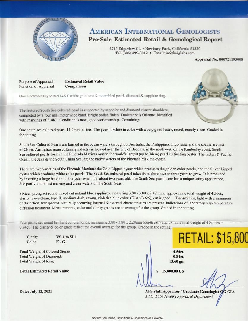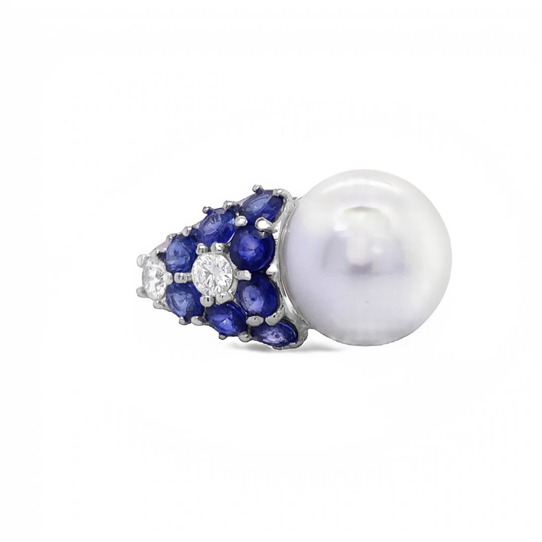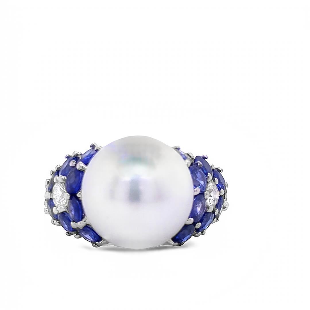 14k Sapphire and Pearl Ring. Please see Photos and Description for all available information. A beautiful and elegant ring featuring a Tahitian pearl, surrounded by sapphires with a design of diamonds.