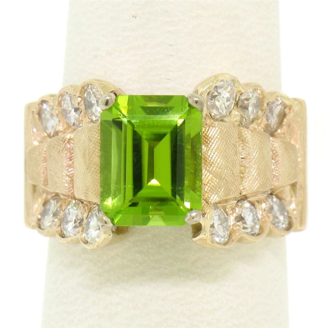 An estate solid 14k yellow gold cocktail ring, with 1 emerlad cut natural peridot (8.8x6.9mm - 2.27ct), and 12 round brilliant cut natural diamonds (F/G- VS1/VS2; 1.40ctw). The ring is size 6.0, weighs a total of 9.80 grams, and measures 12mm wide.
