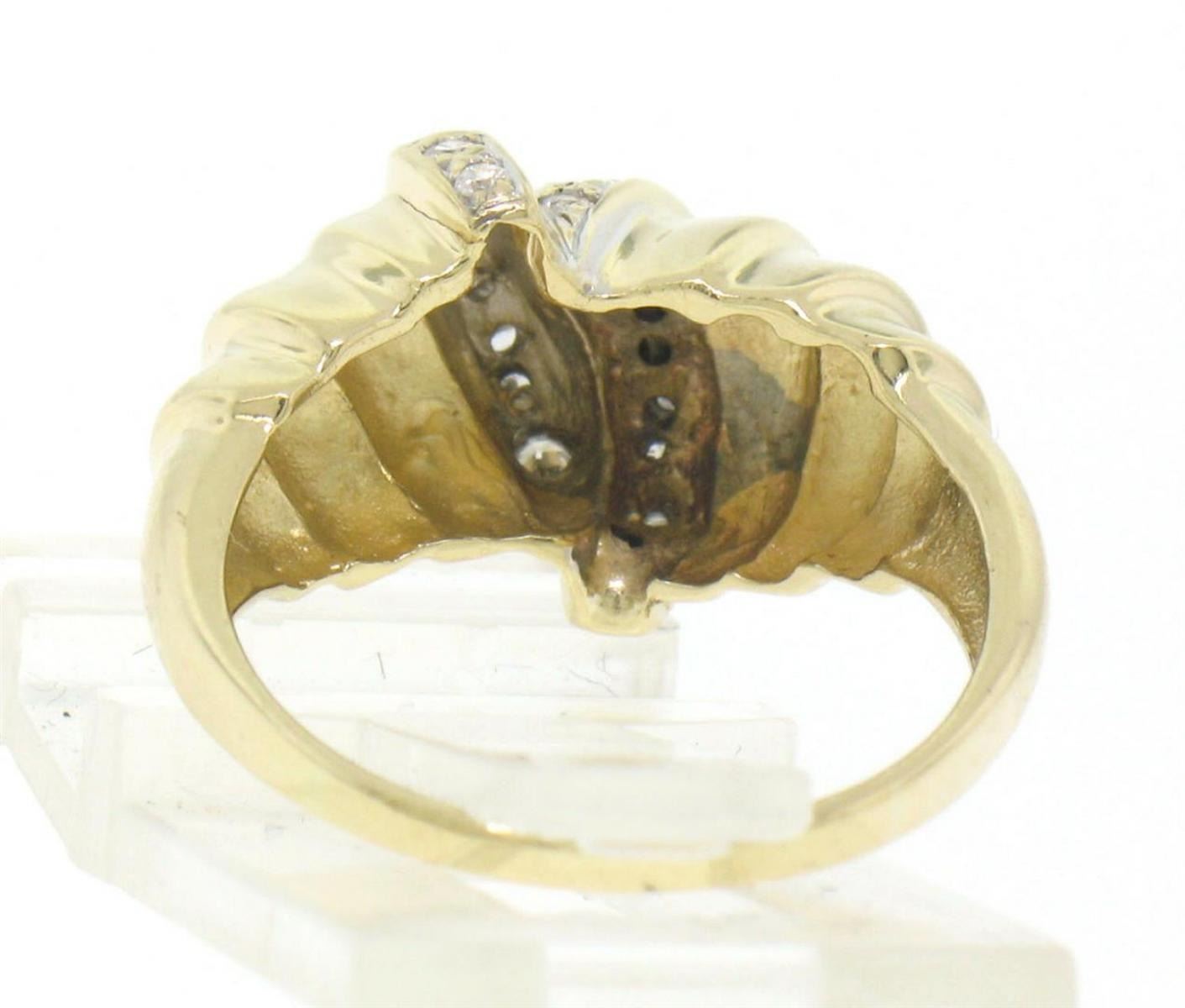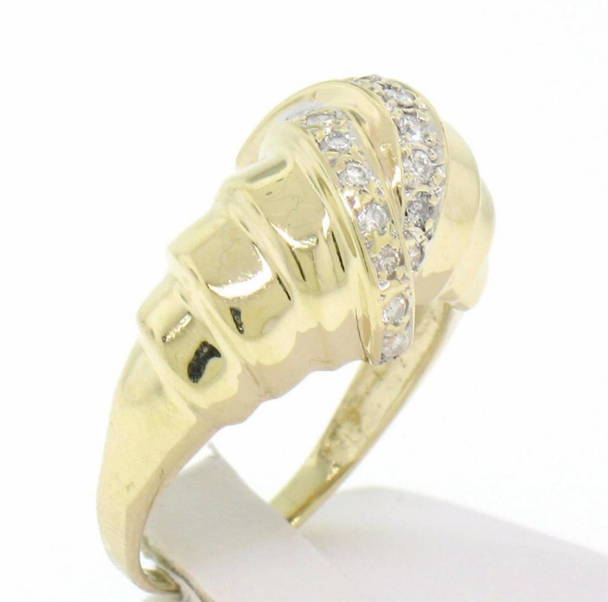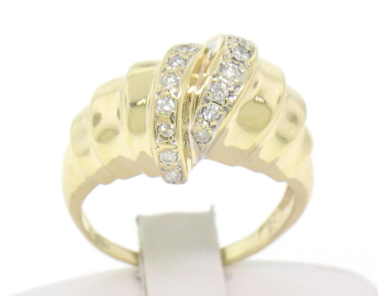 A solid 14k yellow gold band ring with a twist design pave set with 18 round brilliant cut natural diamonds (H - SI1; 0.25ctw). The ring is size 6.0, weighs a total of 4.8 grams, and measures 11.27mm wide.