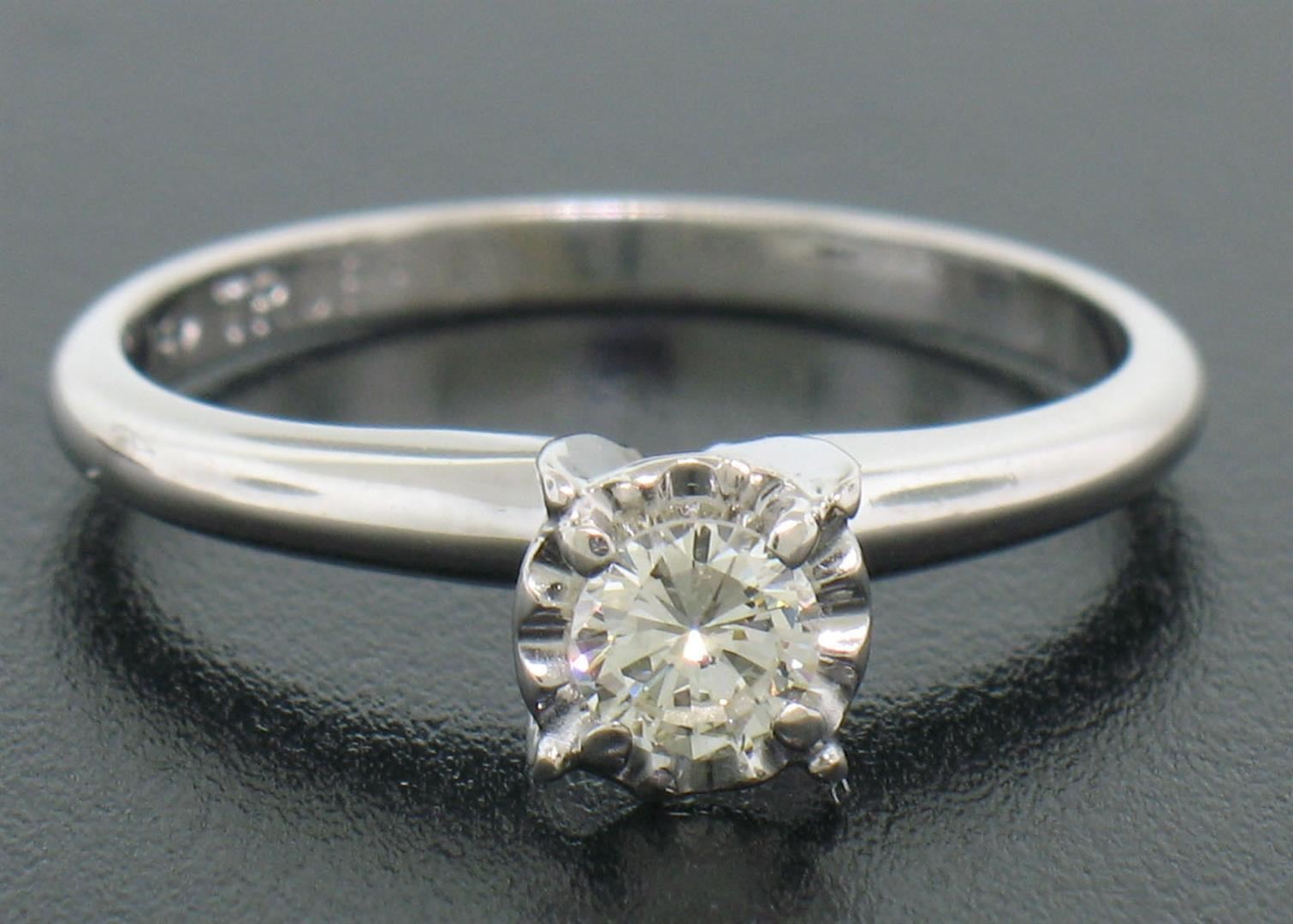 An estate solid 14k white gold solitaire engagement ring, with 1 round brilliant cut natural diamond (H/I- VS1; 0.22ct). The ring is size 5.0, weighs a total of 2.10 grams, and measures 5.50mm wide.