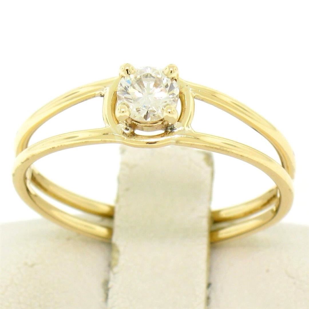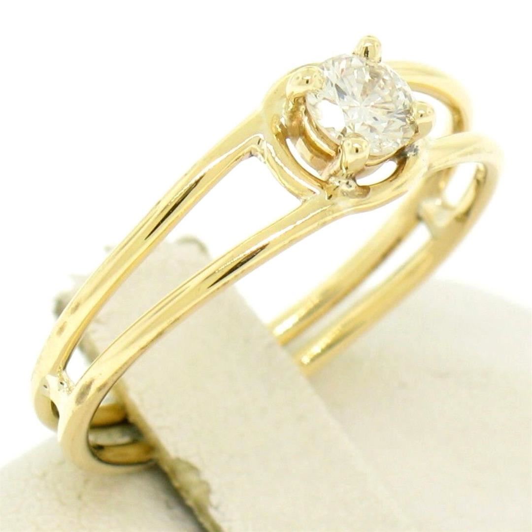 An estate solid 14k yellow gold solitaire open band ring, with 1 round brilliant cut natural diamond (H- VS1; 0.21ct). The ring is size 5.0, weighs a total of 1.7 grams, and measures 5.6mm wide.