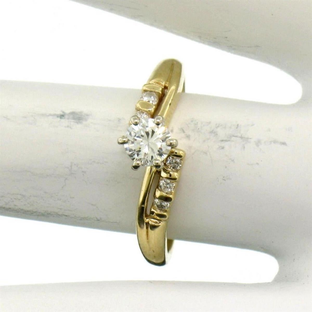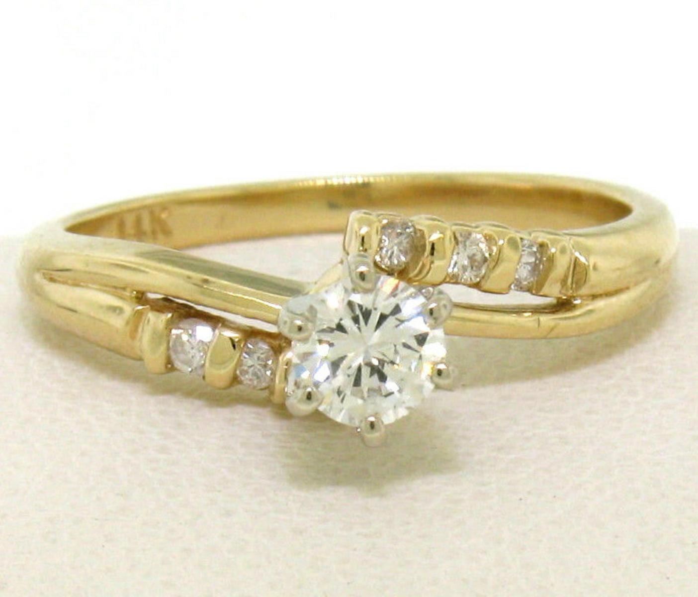 A solid 14k yellow gold engagement ring with a larger round brilliant cut diamond (G/H - SI1; 0.30ct) accented by 6 smaller round brilliant cut diamonds (G/H - SI1; 0.10ctw). The ring is size 6.5, weighs a total of 2.7 grams, and measures 5.8mm wide.