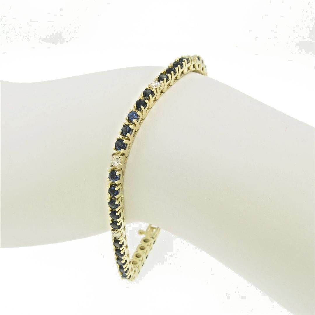 An estate solid 14k yellow gold line tennis bracelet, with 45 round brilliant cut natural sapphires (4.50ctw), and 9 round brilliant cut natural diamonds (G/H - VS1/VS2; 0.63ctw). It weighs a total of 11.8 grams, measures 2.9mm wide, and measures 7.25 inches in length.