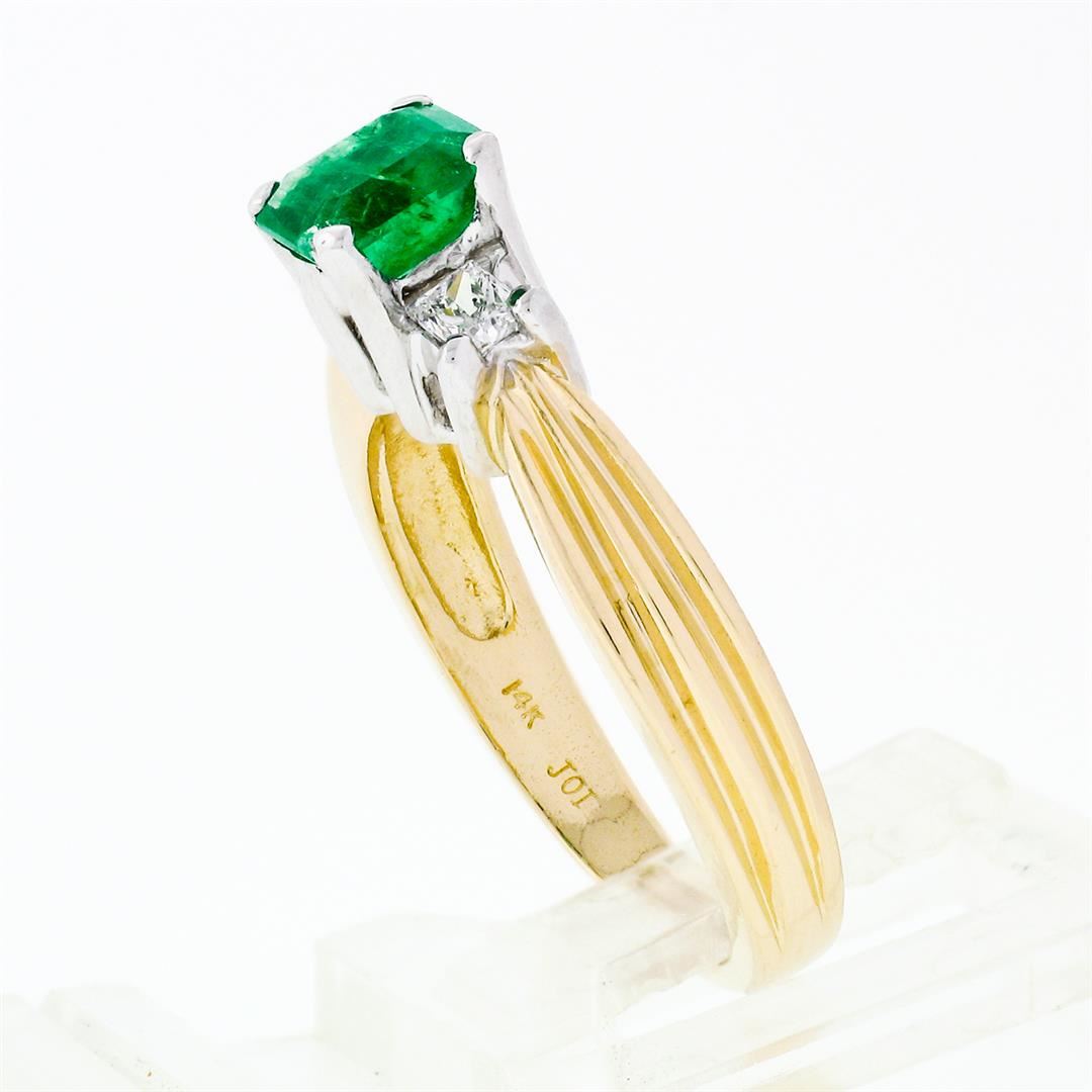 An estate solid 14k yellow & white gold 3 stones ring, with 1 emeradl cut natural emerald (0.88ct), accented with 2 princess cut natural diamonds (G/H - VS1/VS2 ; 0.20ctw). The ring is size 7.5, weighs a total of 4.38 grams, and measures 5.88mm wide.
