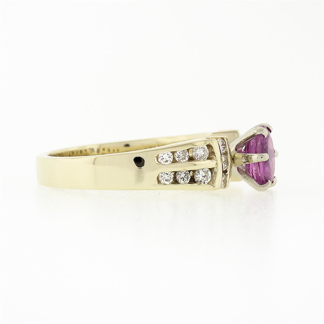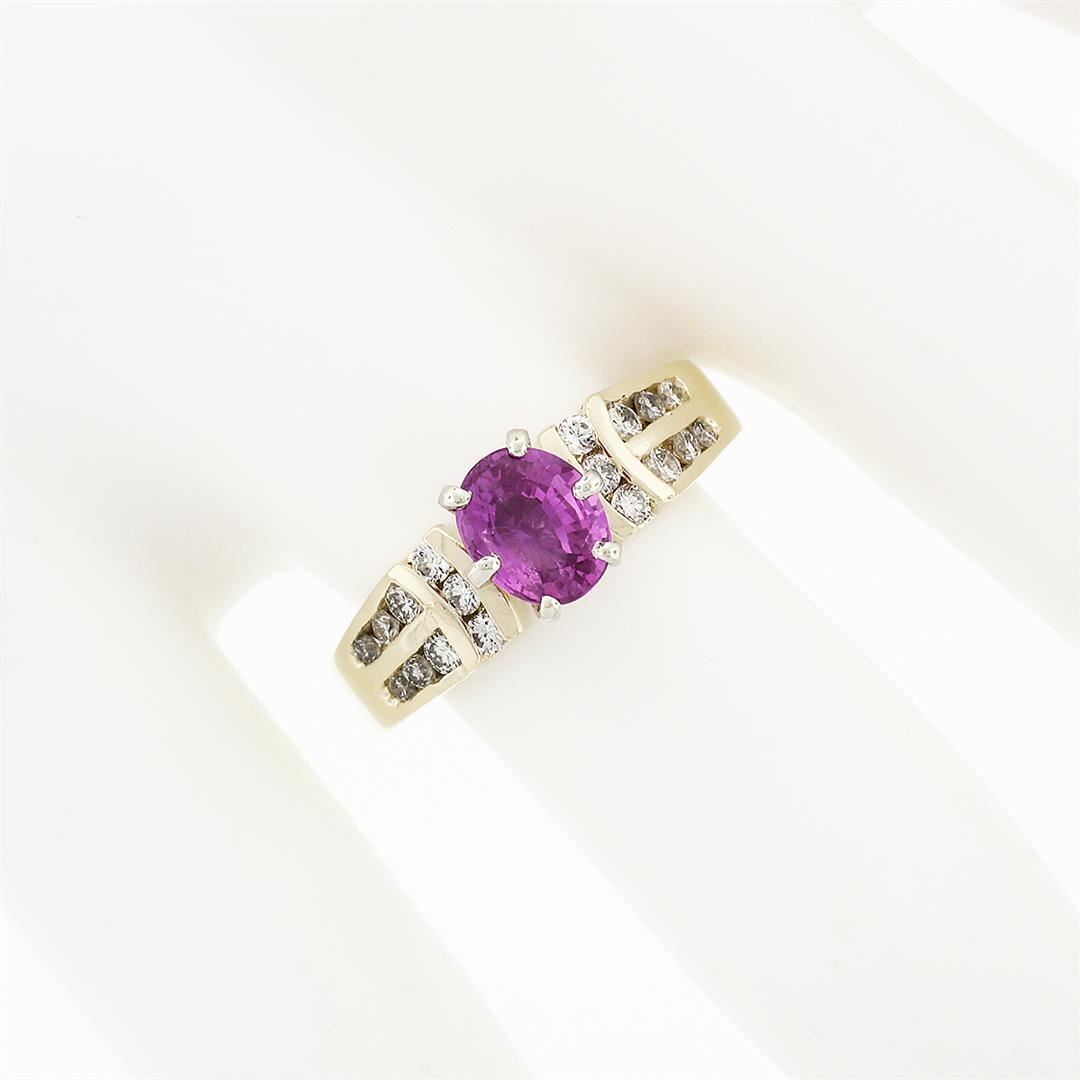 A solid 14k yellow & white gold engagement ring, with 1 oval cut natural pink sapphire (0.83ct ), and 18 round brilliant cut natural diamonds (F/G - VS1/VS2 ; 0.35ctw). The ring is size 6.5, weighs a total of 4.54 grams, and measures 6.8mm wide.