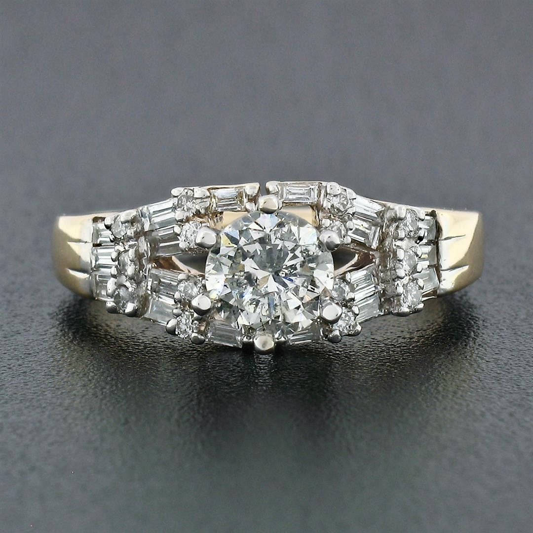 A solid 14k two tone gold engagement ring with 1 round brilliant cut natural diamond solitaire (H/I - I1/I2; 0.83ct) surrounded with a mix of 18 straight baguette cut natural diamonds (H/I - VS1/VS2; 0.45ctw) and 14 round brilliant cut natural diamonds (H/I - VS1/VS2; 0.20ctw). The ring is size 5.0, weighs a total of 5.03 grams, and measures 7.65mm wide.