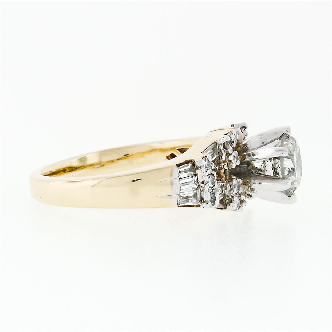 A solid 14k two tone gold engagement ring with 1 round brilliant cut natural diamond solitaire (H/I - I1/I2; 0.83ct) surrounded with a mix of 18 straight baguette cut natural diamonds (H/I - VS1/VS2; 0.45ctw) and 14 round brilliant cut natural diamonds (H/I - VS1/VS2; 0.20ctw). The ring is size 5.0, weighs a total of 5.03 grams, and measures 7.65mm wide.