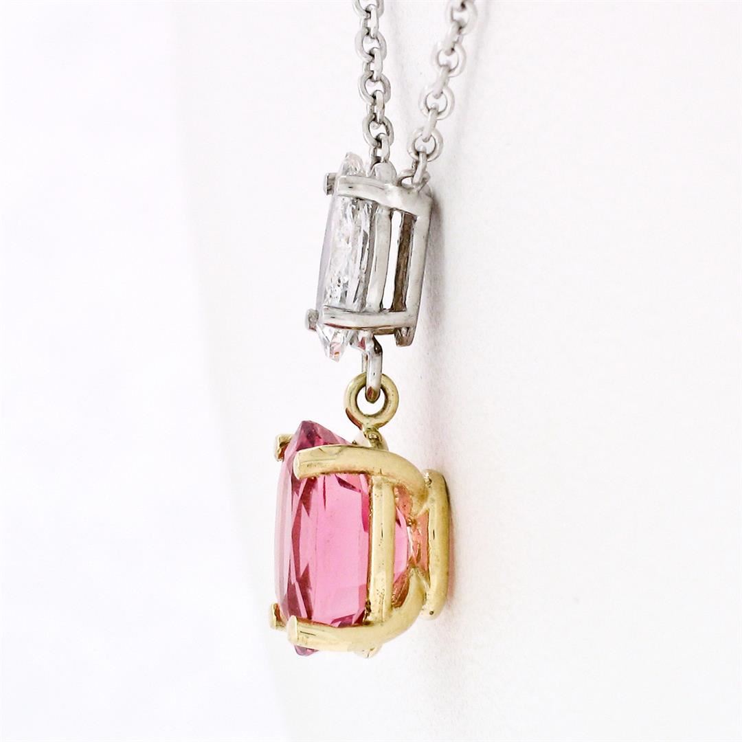 A new solid 14k yellow and white gold pendant necklace, with 1 oval cut tourmaline (8.0x6.10mm - 1.21ct), and 1 marquise cut diamond (H- SI2 ; 0.32ct). The pendant weighs a total of 2.40 grams, measures 17.0x6.10mm including the bail, adjustable to 16 and 18 inch cable link chain.