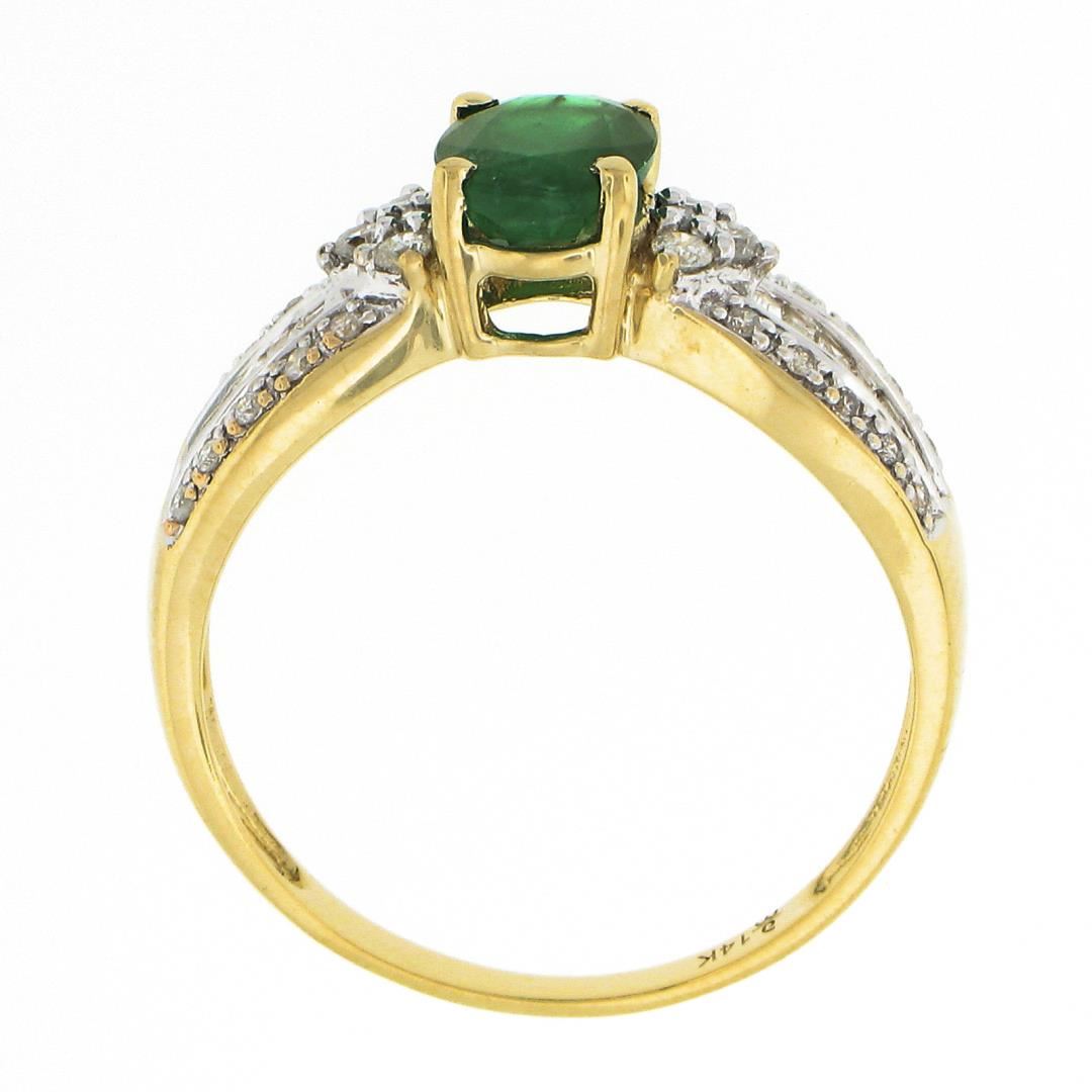 A solid 14k yellow & white gold ring, with 1 oval cut natural emerald (8.06x5.93mm - 1.26ct ), and 28 round brilliant cut natural diamonds (H/I - I1/I2 ; 0.30ctw), and 12 baguette cut natural diamonds (H/I - SI2/I1 ; 0.30ctw). The ring is size 9.0, weighs a total of 3.32 grams, and measures 8.1mm wide.