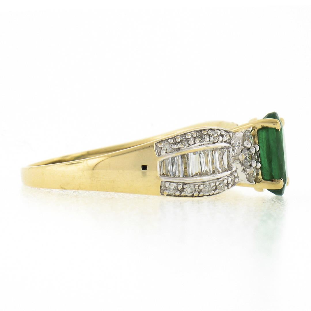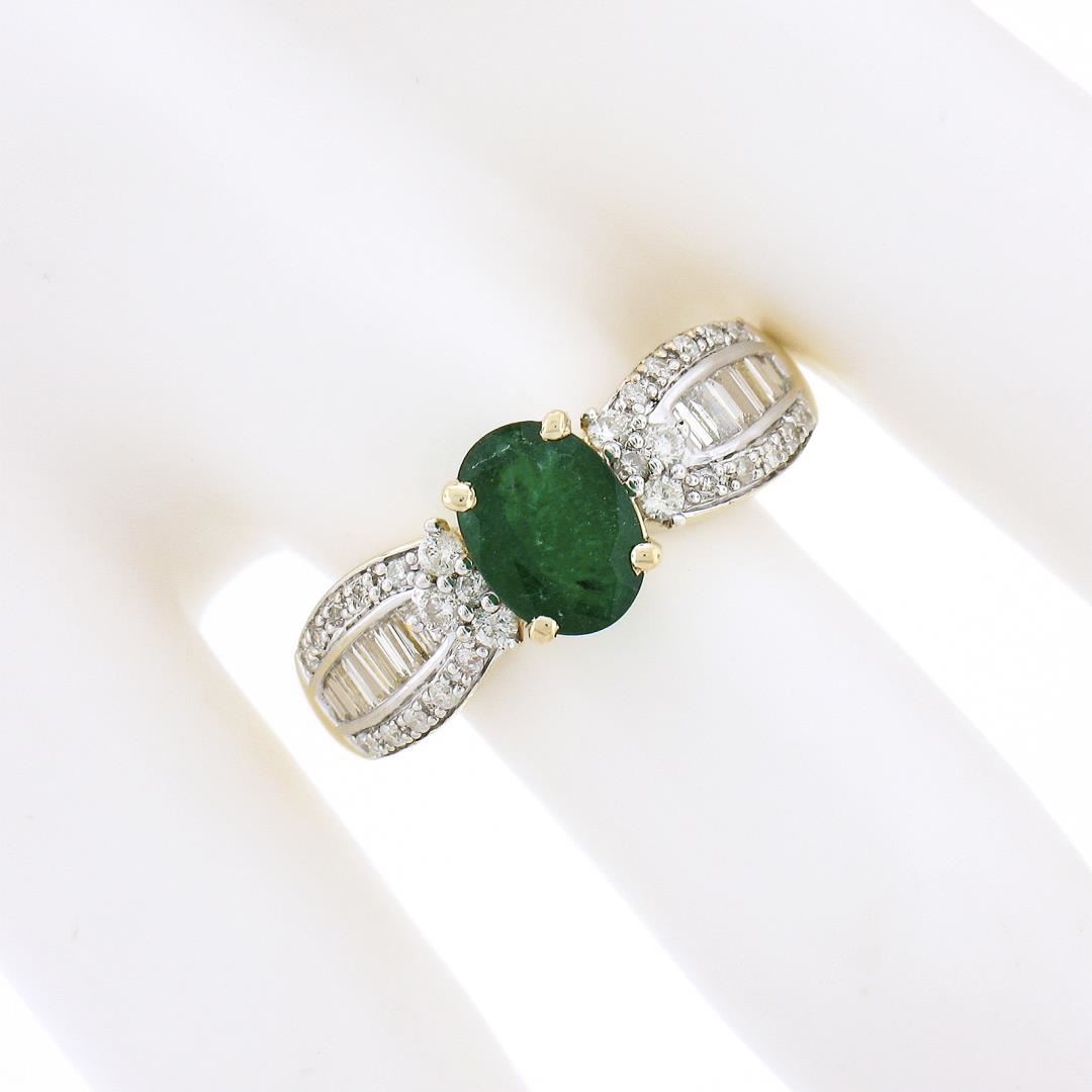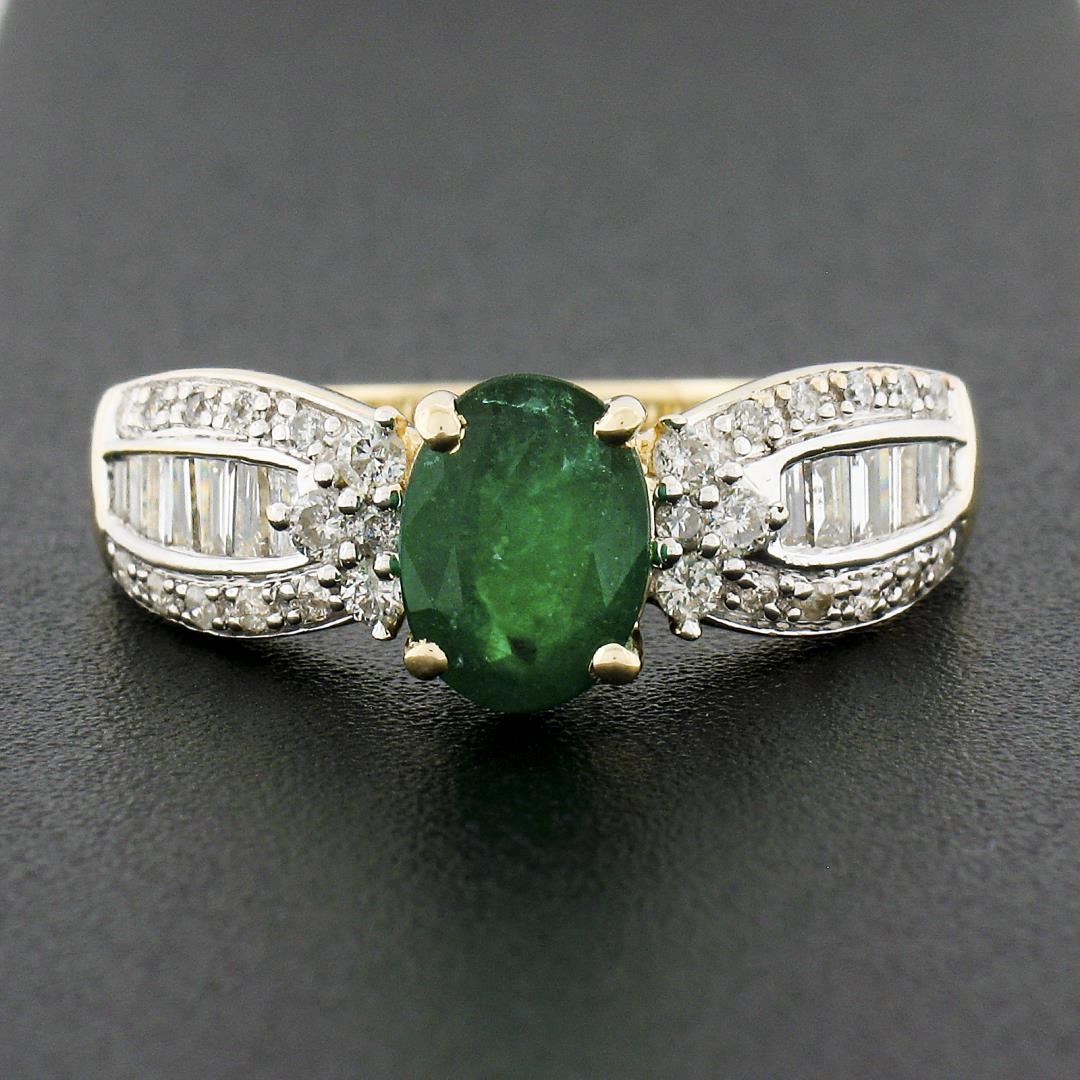 A solid 14k yellow & white gold ring, with 1 oval cut natural emerald (8.06x5.93mm - 1.26ct ), and 28 round brilliant cut natural diamonds (H/I - I1/I2 ; 0.30ctw), and 12 baguette cut natural diamonds (H/I - SI2/I1 ; 0.30ctw). The ring is size 9.0, weighs a total of 3.32 grams, and measures 8.1mm wide.