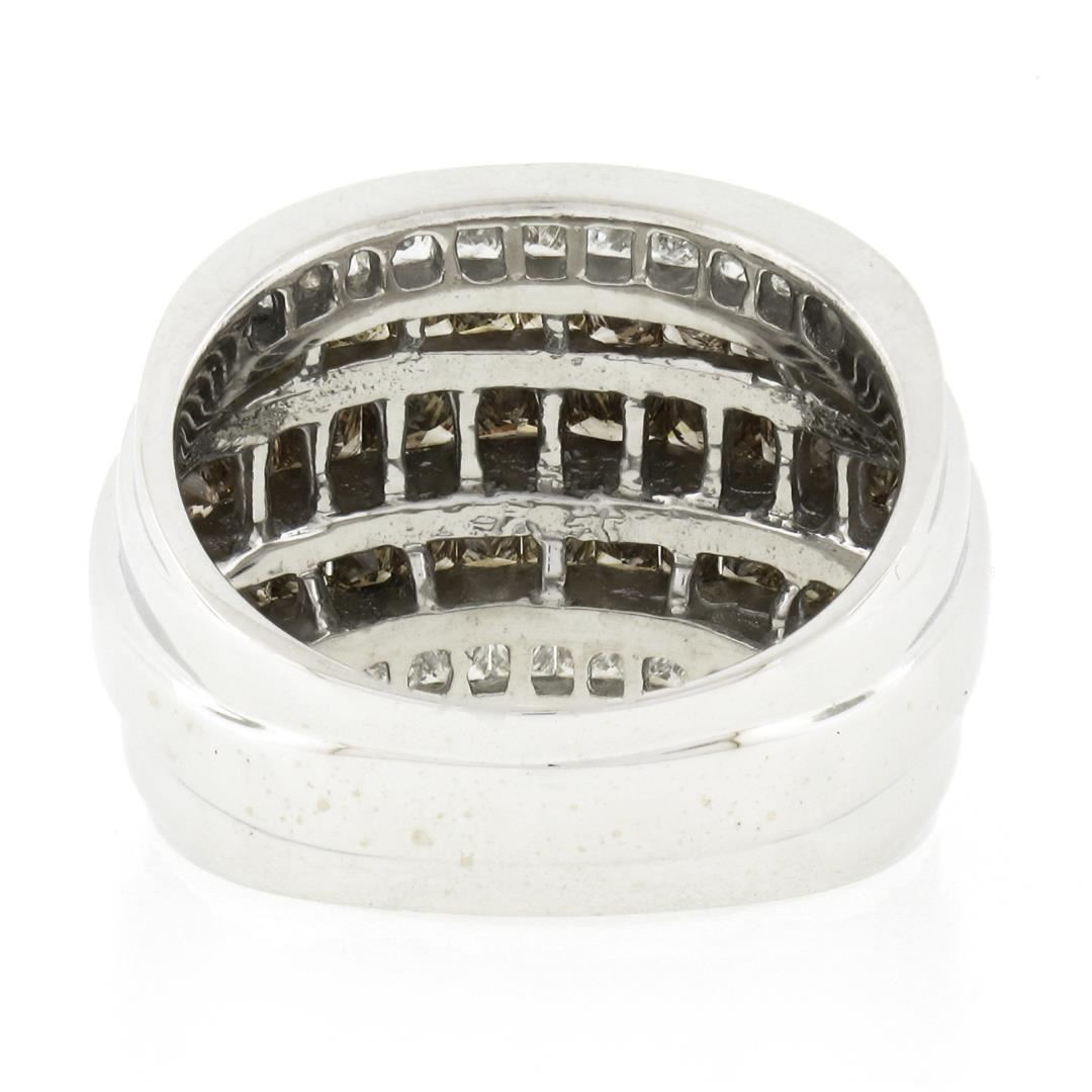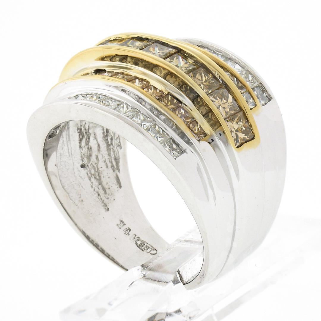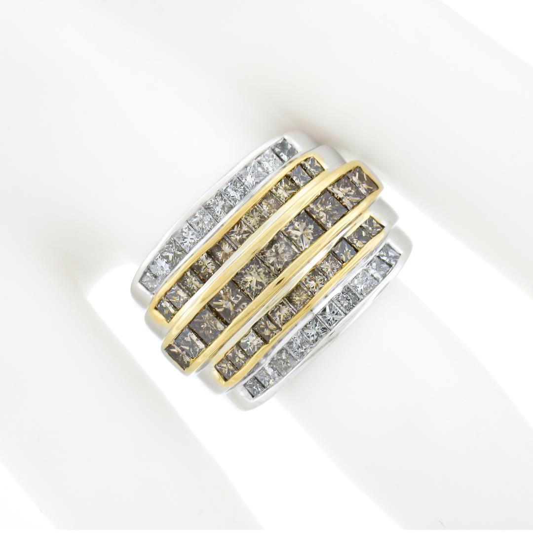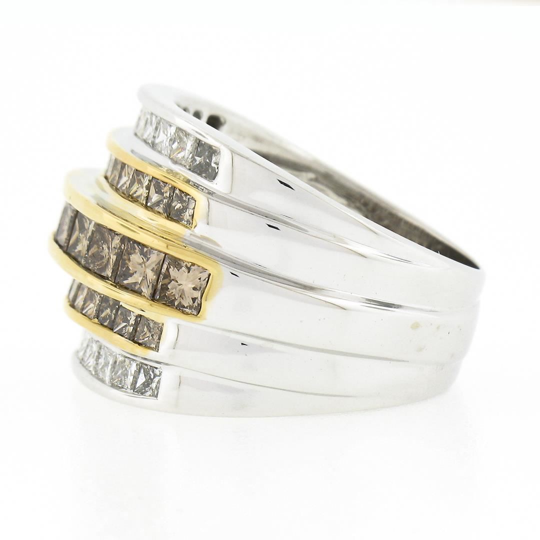 A solid 14k yellow & white gold wide ring, with 20 princess cut natural diamonds (G/H - SI2/I2 ; 1.0ctw), 32 princess cut natural fancy brown diamonds (SI2/I2 ; 2.90ctw). The ring is size 7.0, weighs a total of 10.37 grams, and measures 15.45mm wide.
