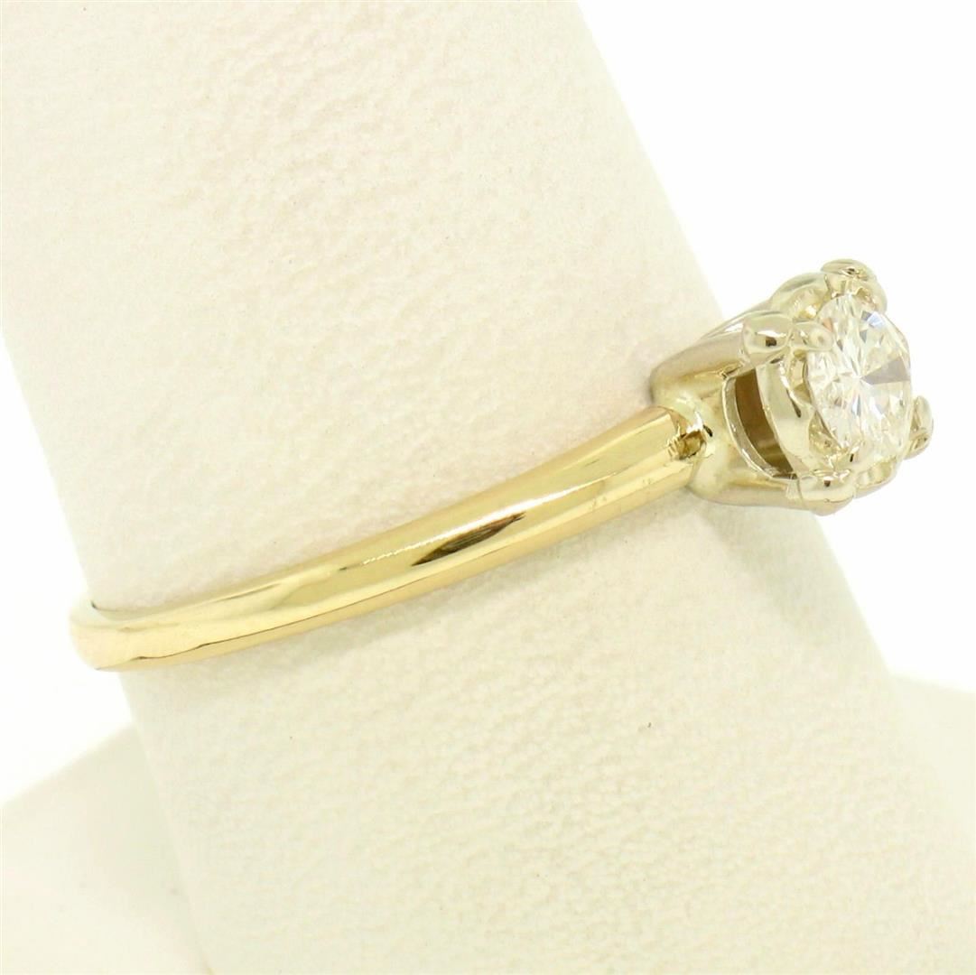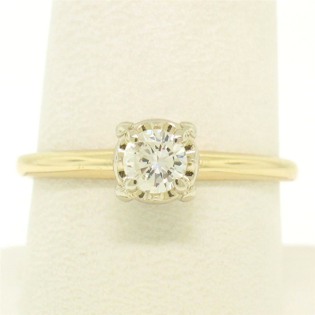 14k Two Tone Gold 0.40ct Illusion Prong Set Round Diamond Solitaire Band Ring. Please see photos and description for all available information. An estate solid white and yellow gold solitaire engagement ring, with 1 round brilliant cut natural diamond (H-