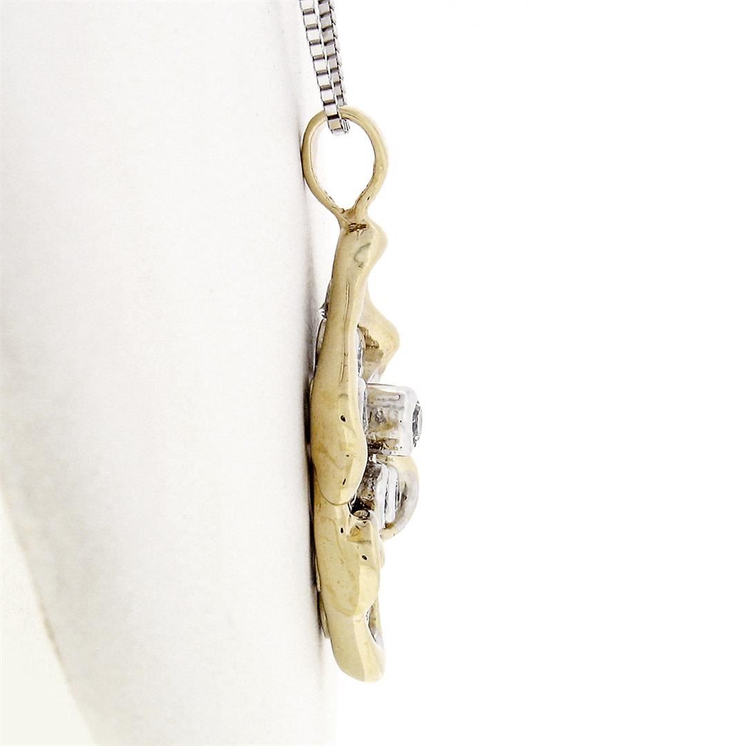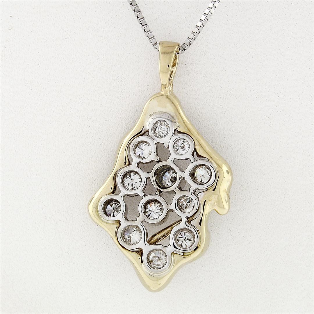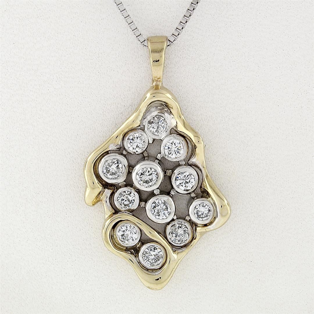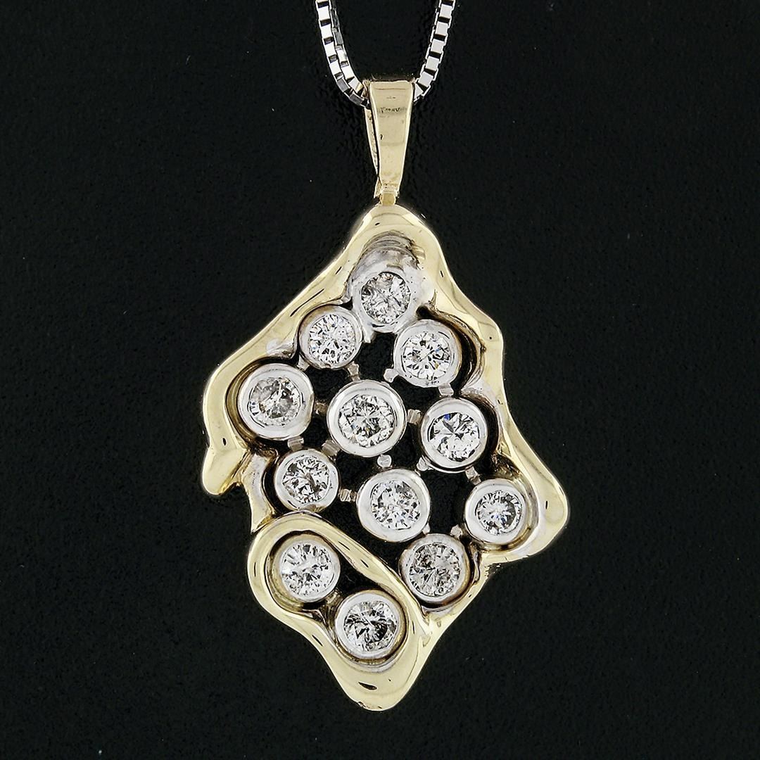 A solid 14k two tone gold freeform bubble pendant necklace, with 12 round brilliant cut natural diamonds (G/H - SI1/SI2 ; 1.06ctw). 18 inch fine box link chain, 7.65 grams total weight, pendant measures 31.98x18.51mm.