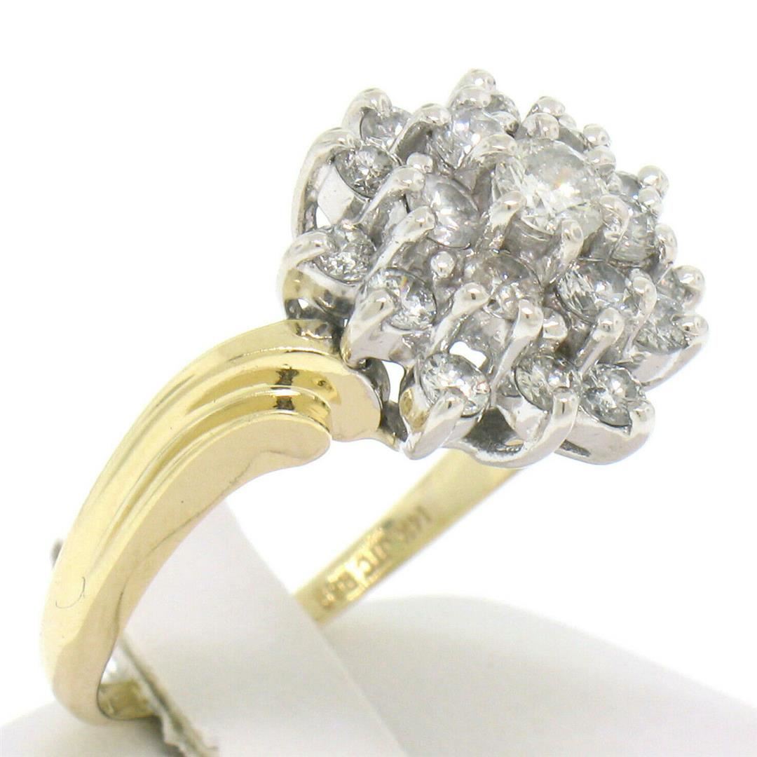 An estate solid 14k white and yellow gold cluster ring, with 19 round brilliant cut natural diamonds (G/H - SI1/SI2 ; 1.1ctw). The ring is size 7.25, weighs a total of 5.40 grams, and measures 13.13mm wide.