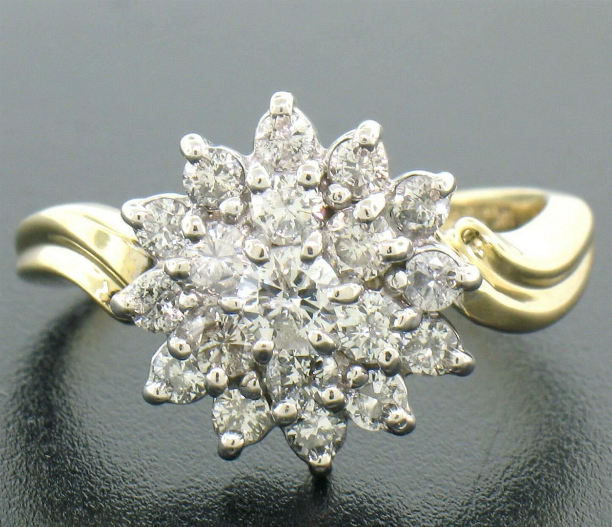 An estate solid 14k white and yellow gold cluster ring, with 19 round brilliant cut natural diamonds (G/H - SI1/SI2 ; 1.1ctw). The ring is size 7.25, weighs a total of 5.40 grams, and measures 13.13mm wide.