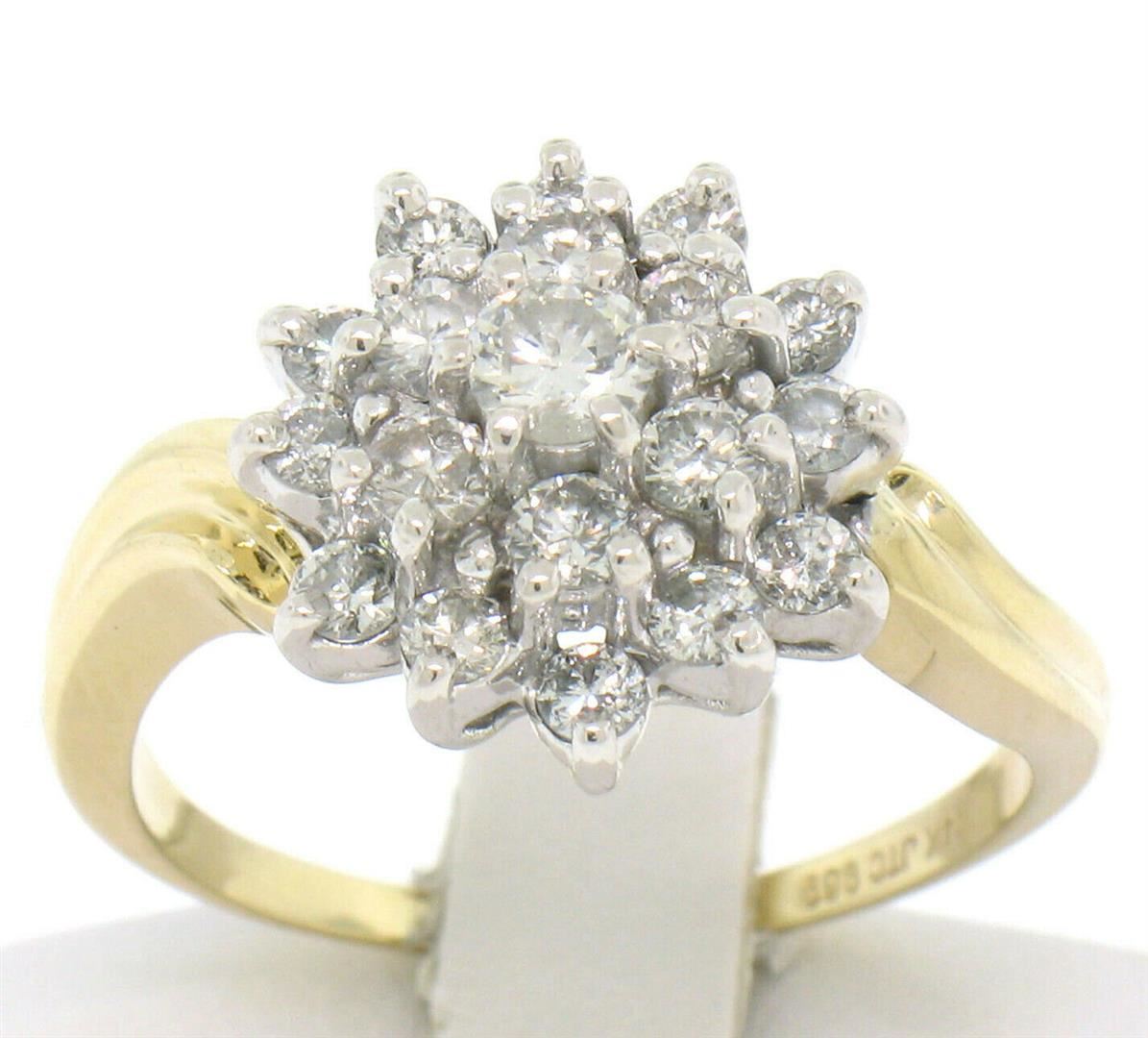 An estate solid 14k white and yellow gold cluster ring, with 19 round brilliant cut natural diamonds (G/H - SI1/SI2 ; 1.1ctw). The ring is size 7.25, weighs a total of 5.40 grams, and measures 13.13mm wide.