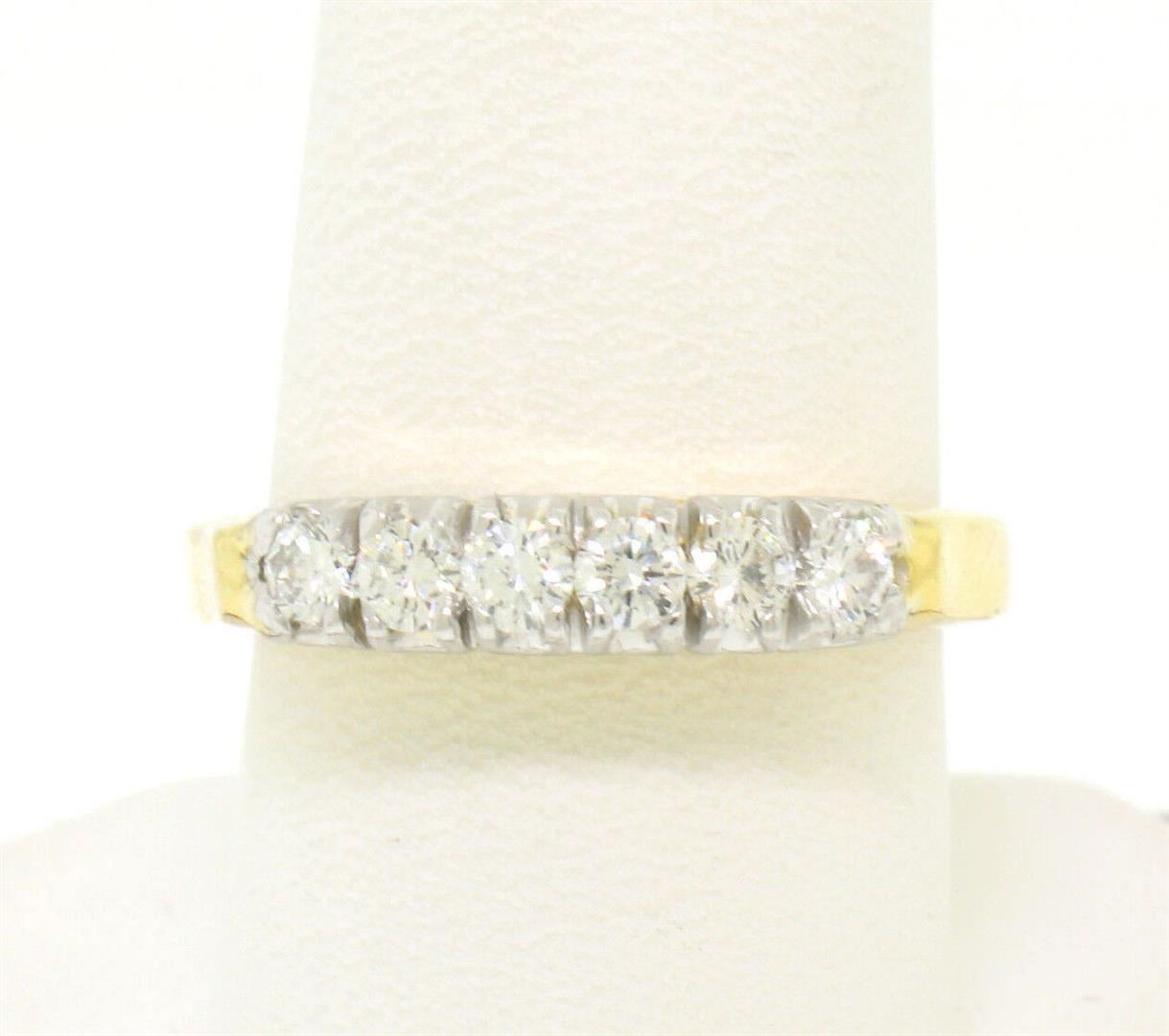 An estate solid 14k yellow and white gold band ring. with 6 brilliant cut natural diamonds (F - VS1; 0.60ctw). The ring is size 9.0, weighs a total of 6.60 grams, and measures 19.75mm wide.