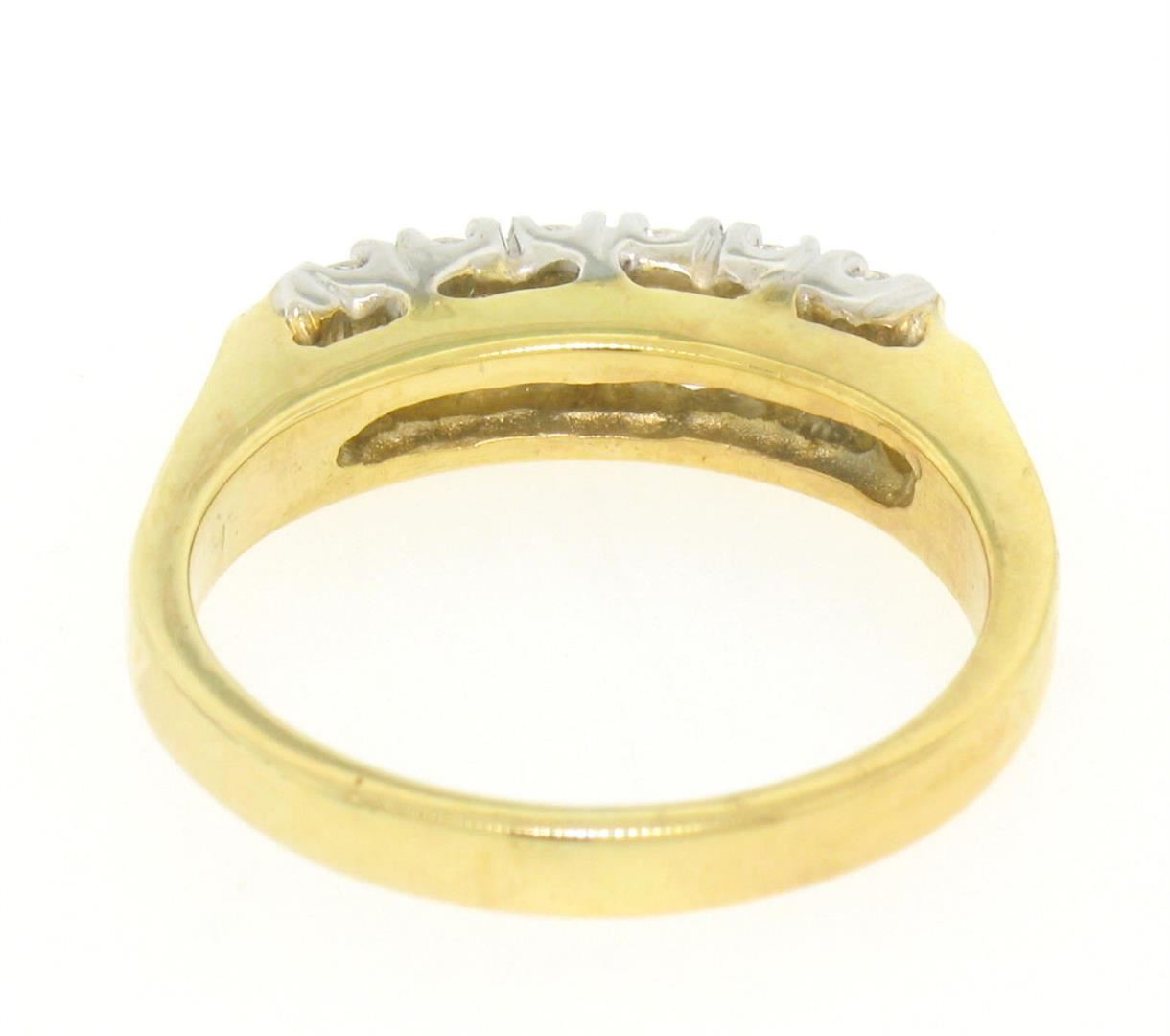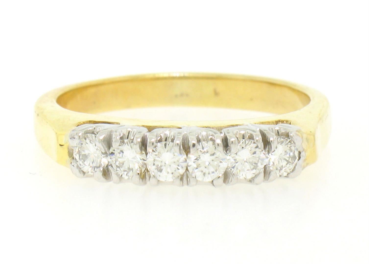 An estate solid 14k yellow and white gold band ring. with 6 brilliant cut natural diamonds (F - VS1; 0.60ctw). The ring is size 9.0, weighs a total of 6.60 grams, and measures 19.75mm wide.