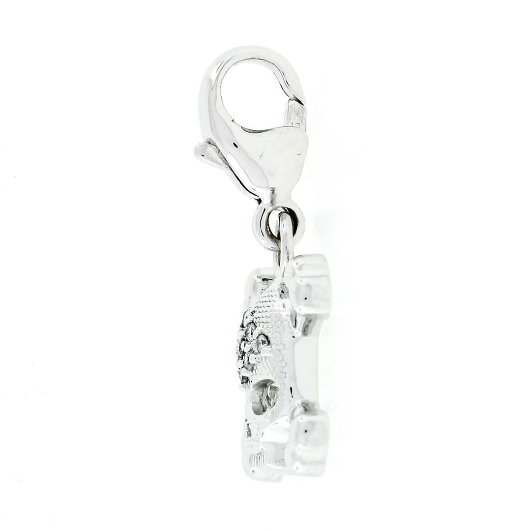 A solid 14k white gold skull & crossbones charm pendant, with 9 round brilliant cut natural dimaonds (F/G - VS1/VS2; 0.12ctw). The pendant weighs a total of 2.81 grams, measures 24.13x13.20mm including the bail, and the inside of the bail measures 3.6mm.
