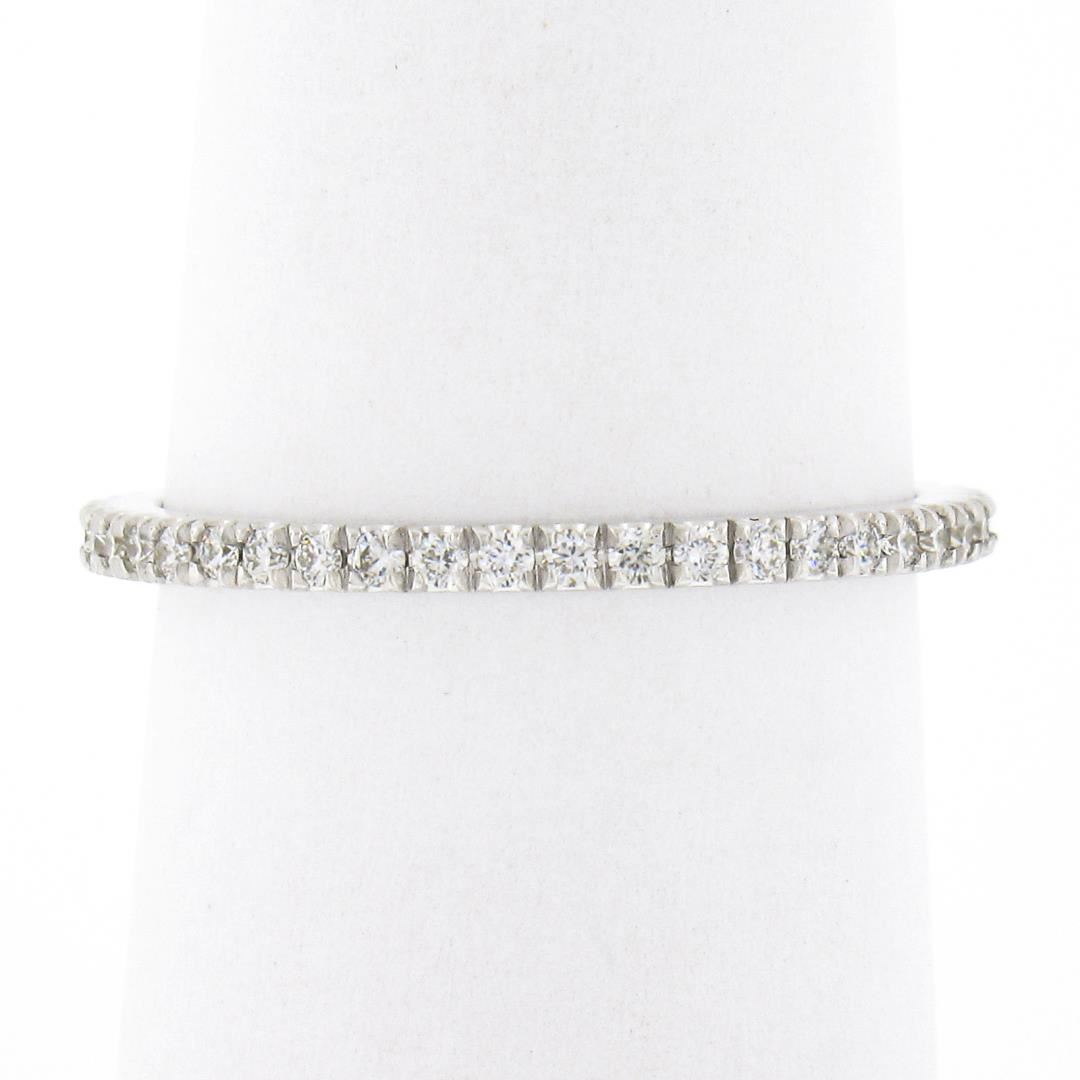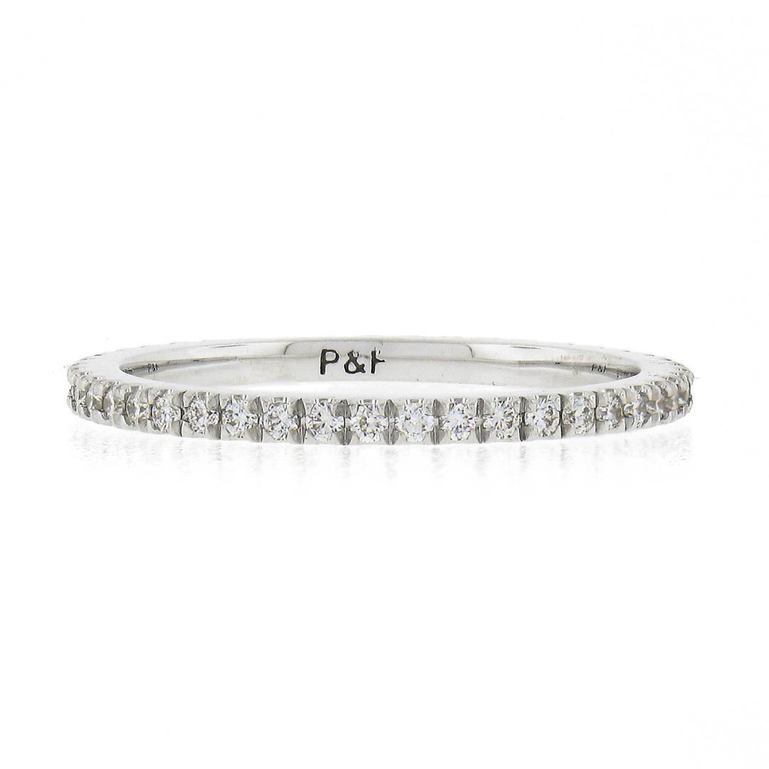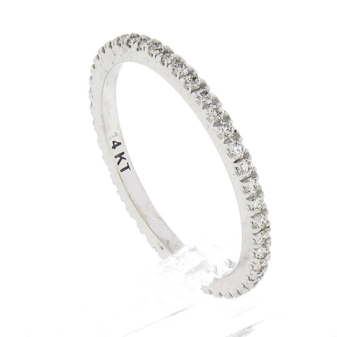A solid 14k white gold band ring, with 43 round brilliant cut natural diamonds (F/G - VS1/VS2 ; 0.33ctw). The ring is size 6.5, weighs a total of 1.50 grams, and measures 1.5mm wide.