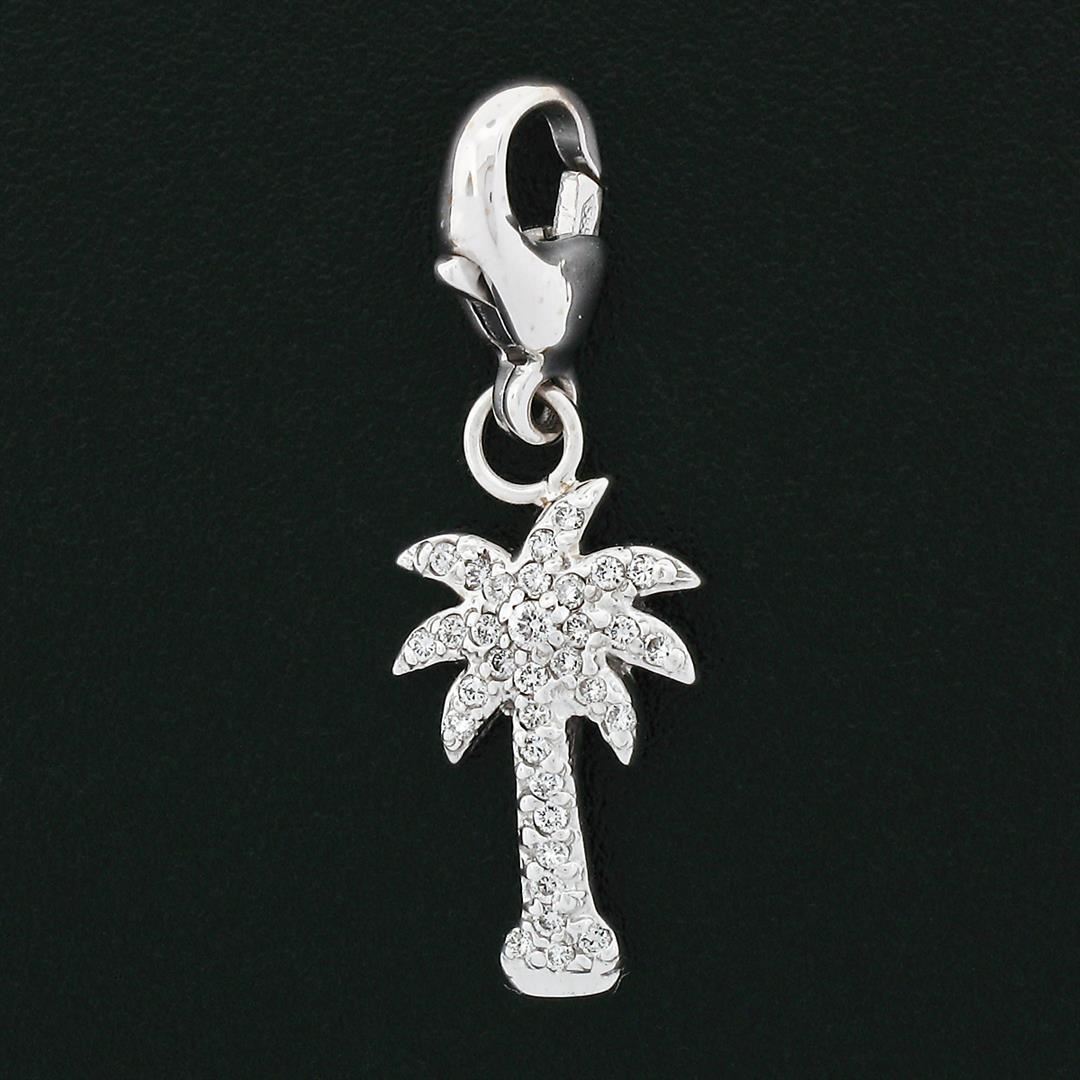 A solid 14k white gold palm tree charm pendant, with 33 round. brilliant cut natural diamonds (G/H - VS2 ; 0.36ctw). The pendant weighs a total of 1.82 grams, measures 29.14x10.06mm including the bail, and the inside of the bail measures 3.5mm.