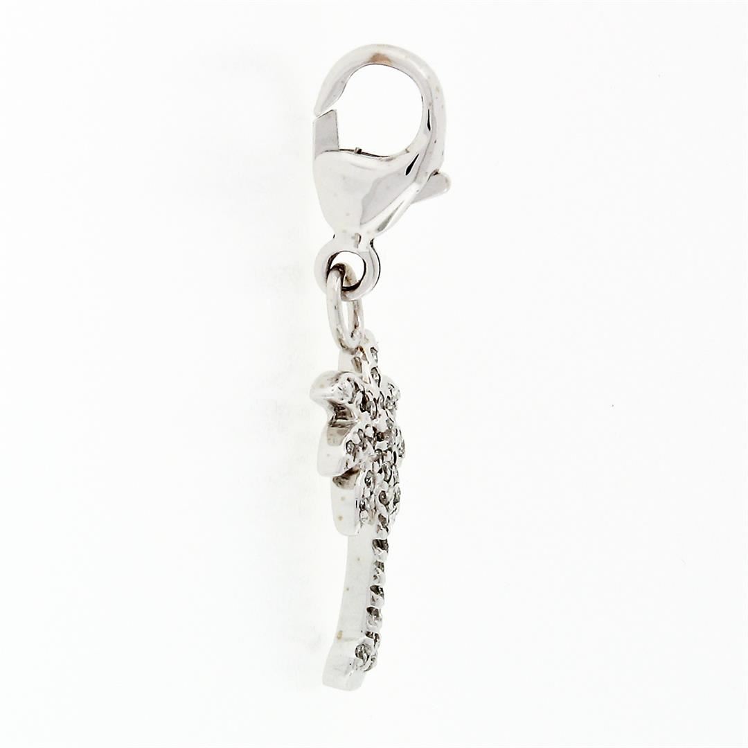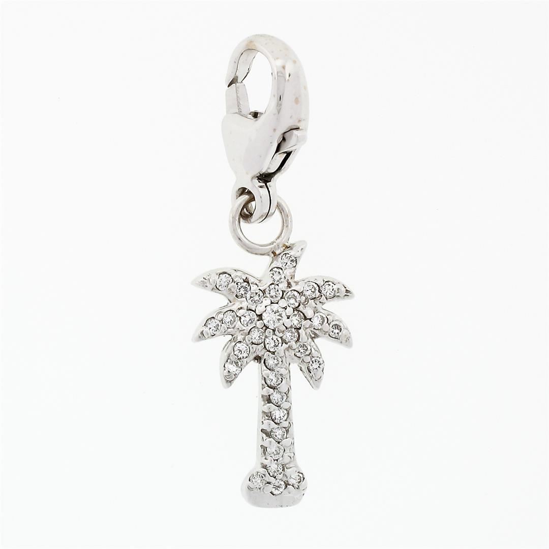 A solid 14k white gold palm tree charm pendant, with 33 round. brilliant cut natural diamonds (G/H - VS2 ; 0.36ctw). The pendant weighs a total of 1.82 grams, measures 29.14x10.06mm including the bail, and the inside of the bail measures 3.5mm.