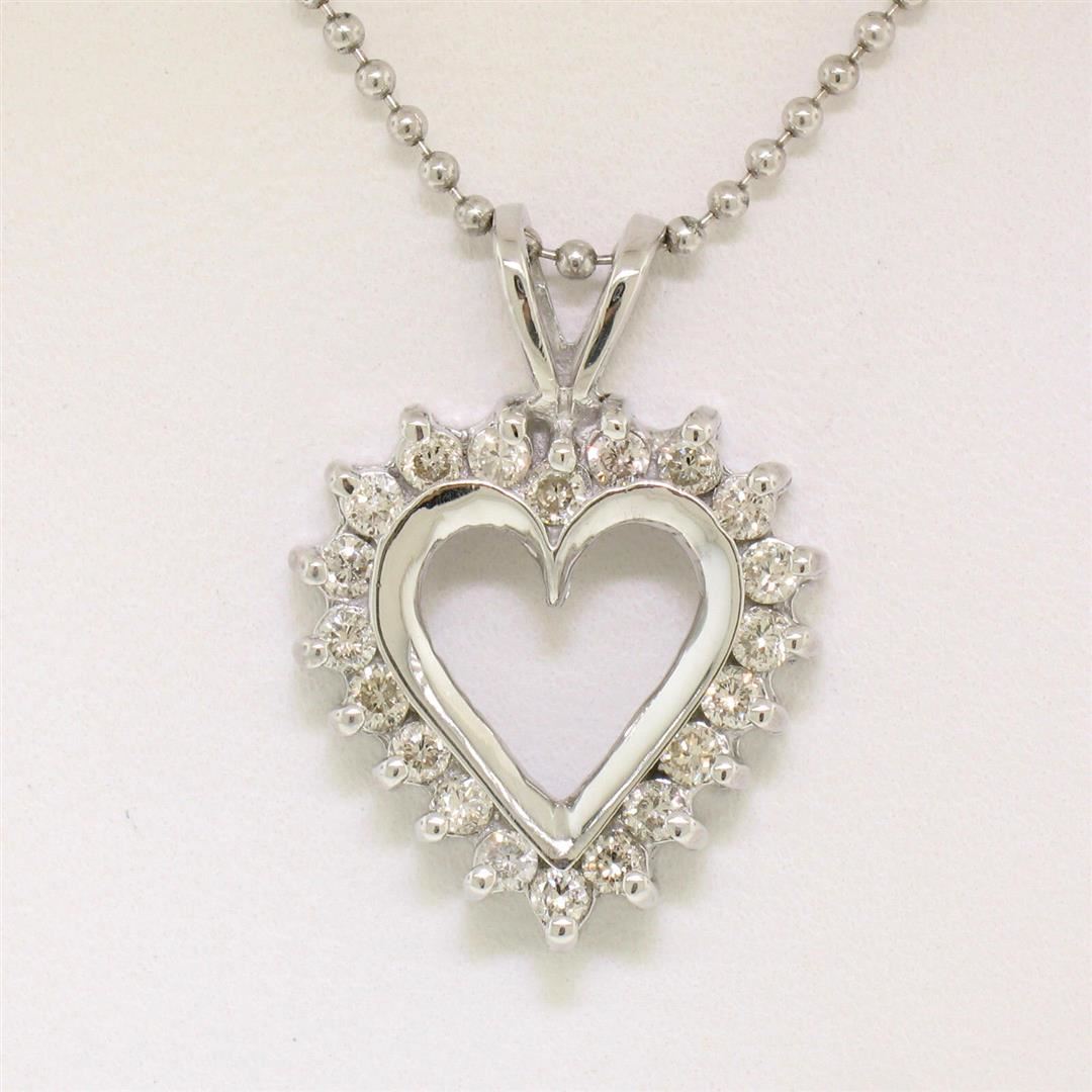 An estate solid 14k white gold heart pendant necklace, with 20 round brilliant cut natural diamonds (H/I- SI1/SI2; 0.40ctw). The pendant weighs a total of 4.83 grams, measures 21.55x15.65mm including the bail, and 16 inch bead link chain.