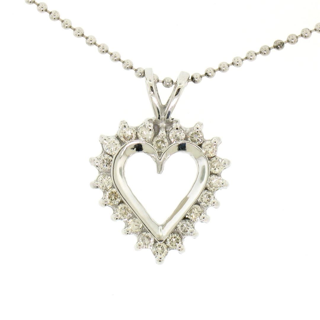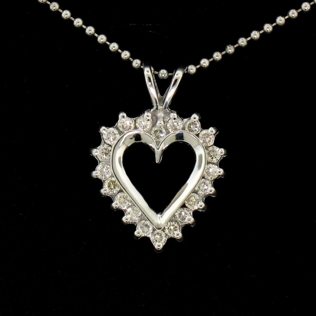 An estate solid 14k white gold heart pendant necklace, with 20 round brilliant cut natural diamonds (H/I- SI1/SI2; 0.40ctw). The pendant weighs a total of 4.83 grams, measures 21.55x15.65mm including the bail, and 16 inch bead link chain.