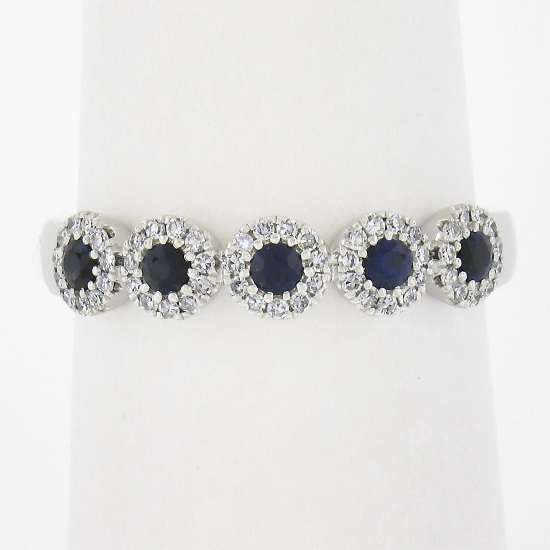 A solid 14k white gold band ring, with 5 round cut natural sapphires (0.25ctw), and 55 single cut natural diamonds (G/H - VS1/VS2 ; 0.20ctw ). The ring is size 7.0, weighs a total of 2.54 grams, and measures 4.3mm wide.
