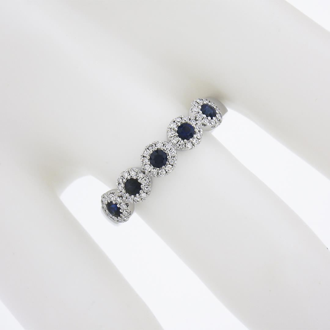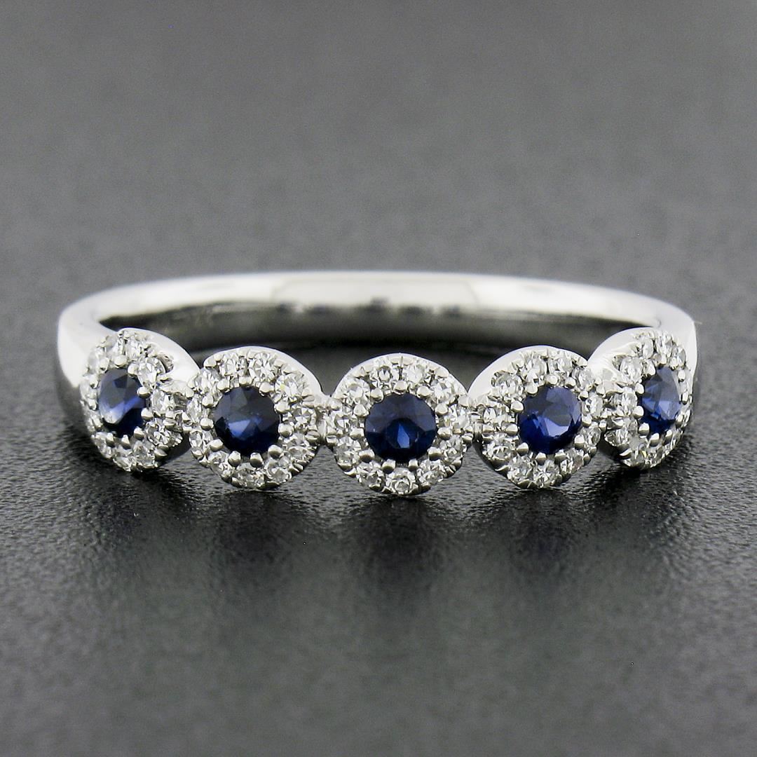A solid 14k white gold band ring, with 5 round cut natural sapphires (0.25ctw), and 55 single cut natural diamonds (G/H - VS1/VS2 ; 0.20ctw ). The ring is size 7.0, weighs a total of 2.54 grams, and measures 4.3mm wide.