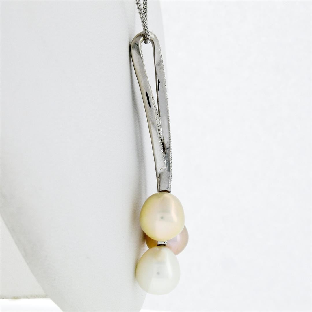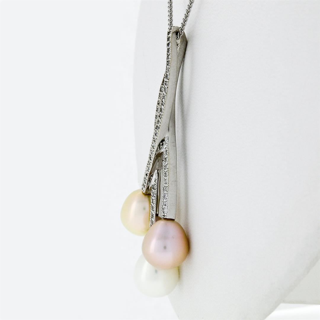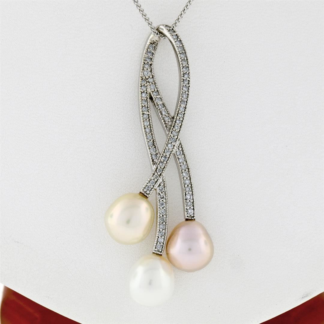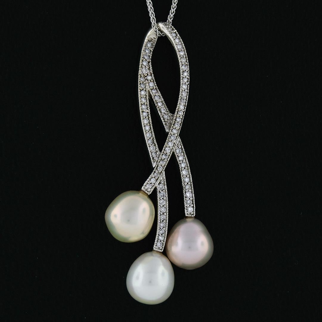 A 14k white gold pendant necklace featuring 3 cultured pearls and 69 round brilliant diamonds (H/I - VS2/SI1; 0.55ctw). 18 inch wheat link chain, 9.51 grams total weight, pendant measures 53.4x20.5mm.