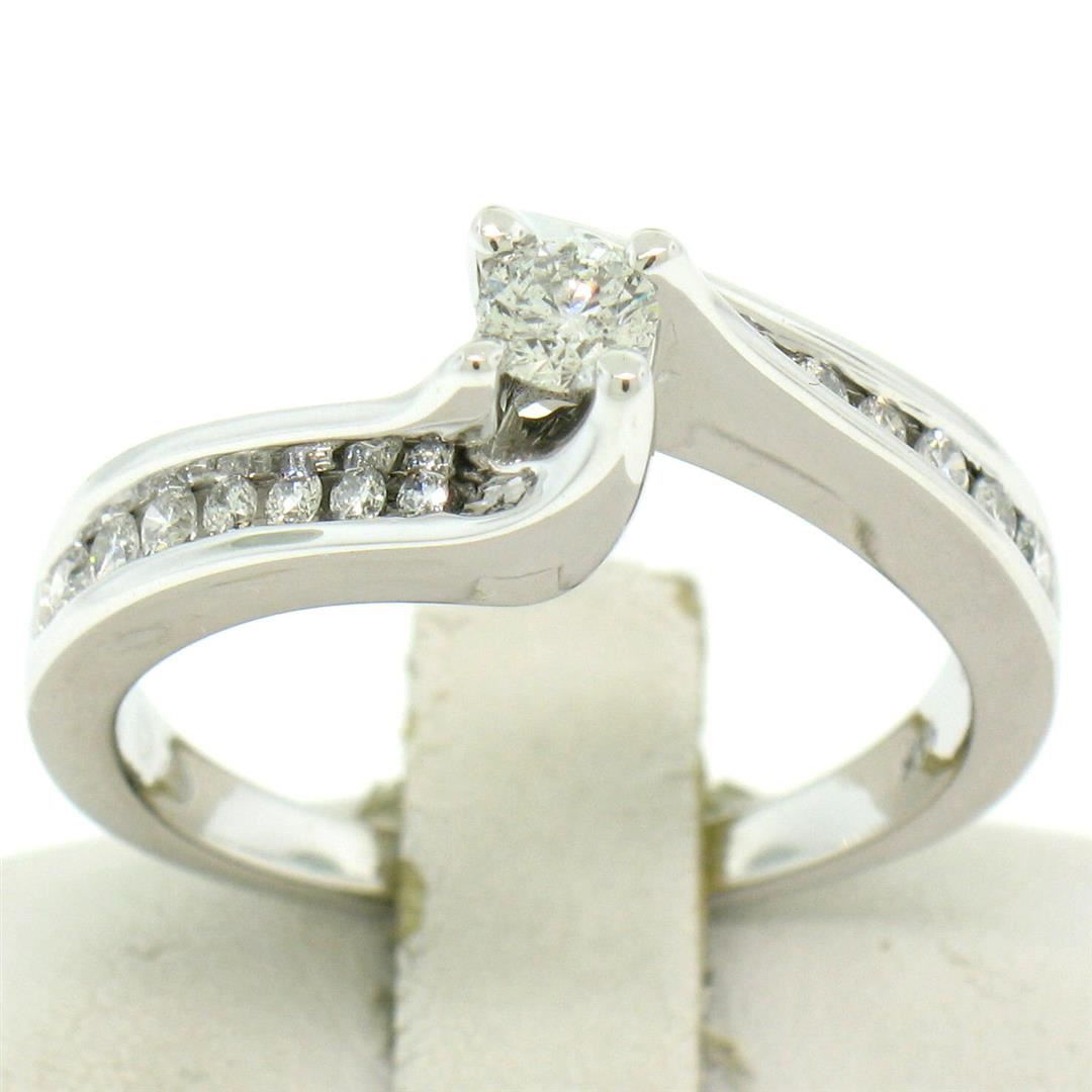 An estate solid 14k white gold solitaire twist bypass ring, featuring 1 round brilliant cut natural diamond (G/H - SI2; 0.18ct), accented with 14 round brilliant cut natural diamonds (G/H - SI2; 0.37ctw). The ring is size 7.0, weighs a total of 4.7 grams, and measures 7.2mm wide.