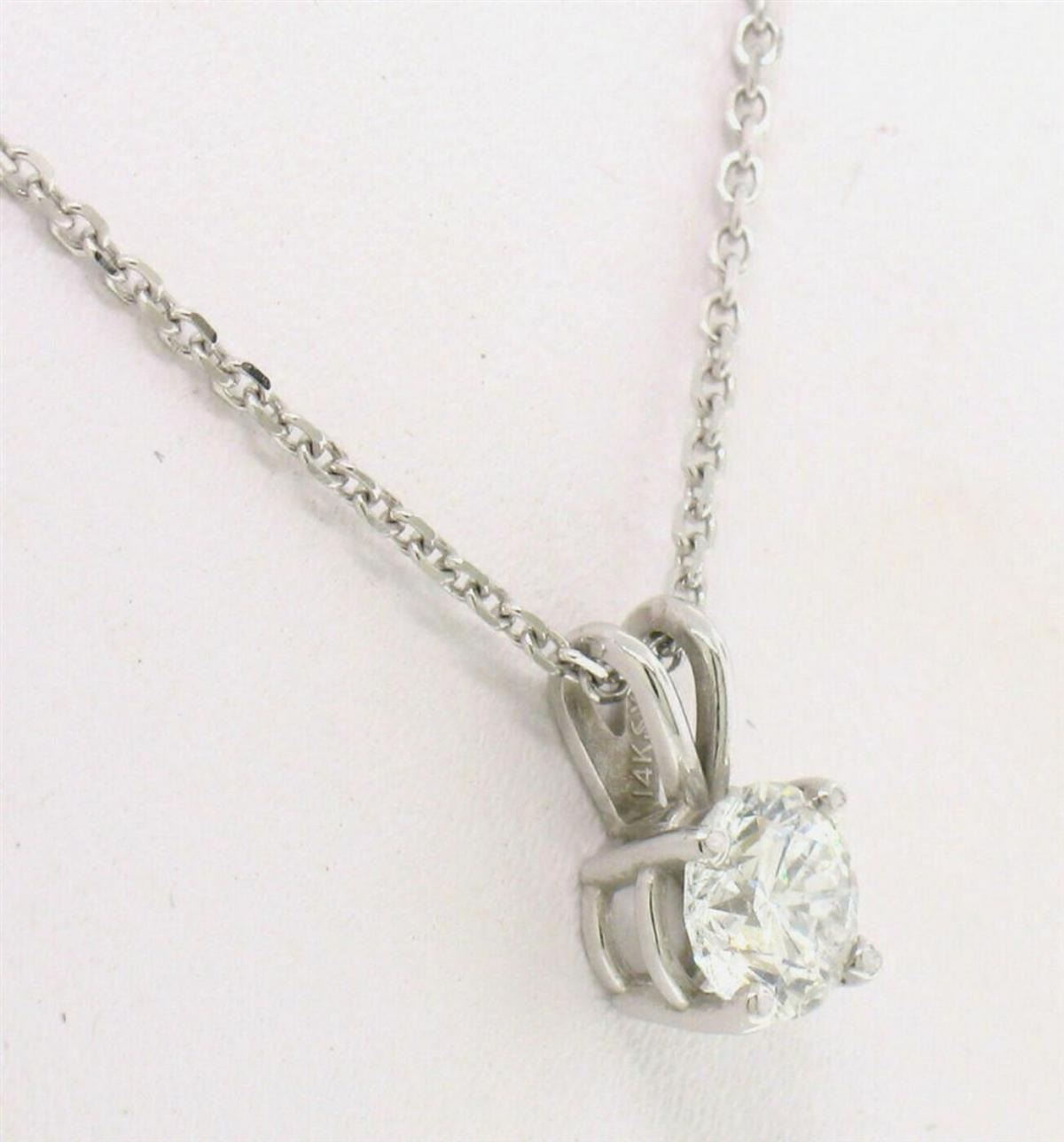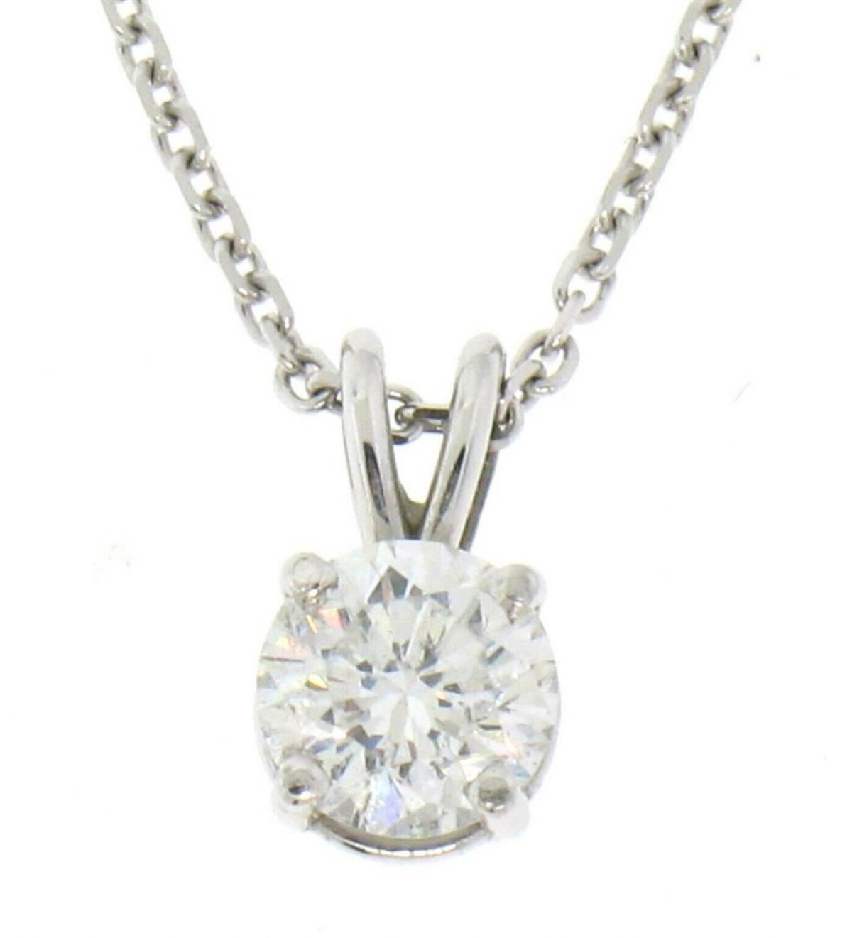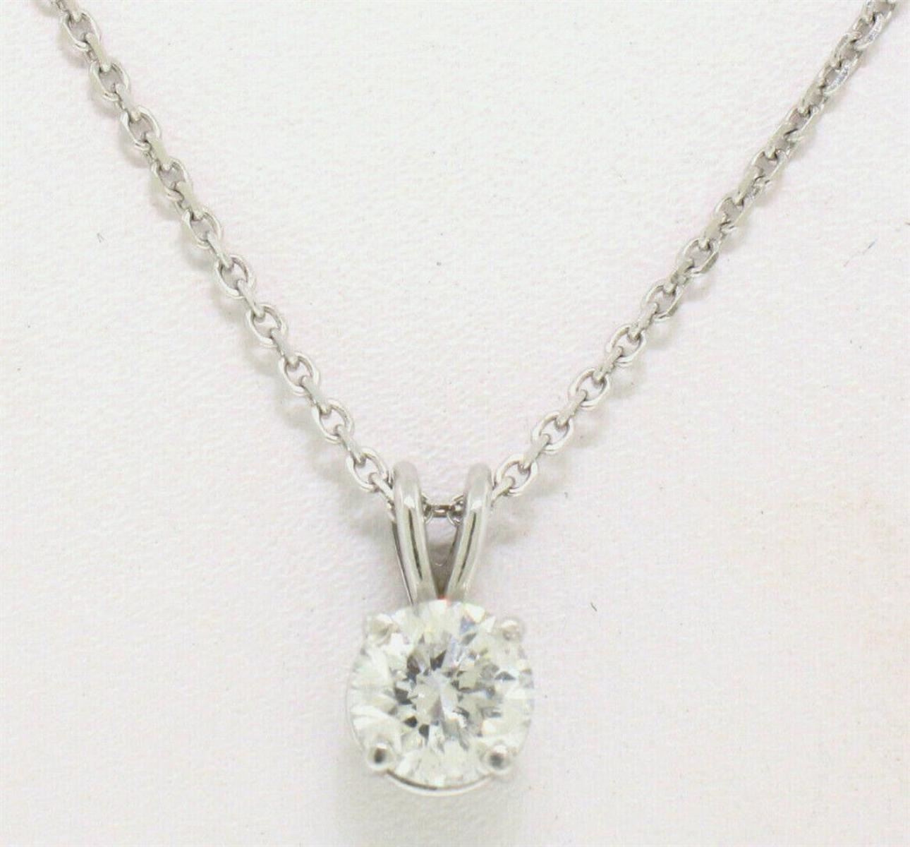 One NEW 14k White Gold 0.55ctw Round F SI1 Diamond Solitaire Pendant w/ Cable Chain. Item Details: Material: Solid 14k White Gold, Weight: 2.10 Grams, Stone(s): (1) Natural Genuine Diamond - Round Brilliant Cut - Prong Set - F Color - SI1 Clarity, Total Carat Weight: 0.55 (exact), Chain Type: Cable Link - Lobster Claw Clasp - Solid 14k White Gold, Chain Length: 16 Inches, Clasp: Lobster Claw, Width: 5.40mm Height (w/ Bail): 9.50mm Condition: Brand New