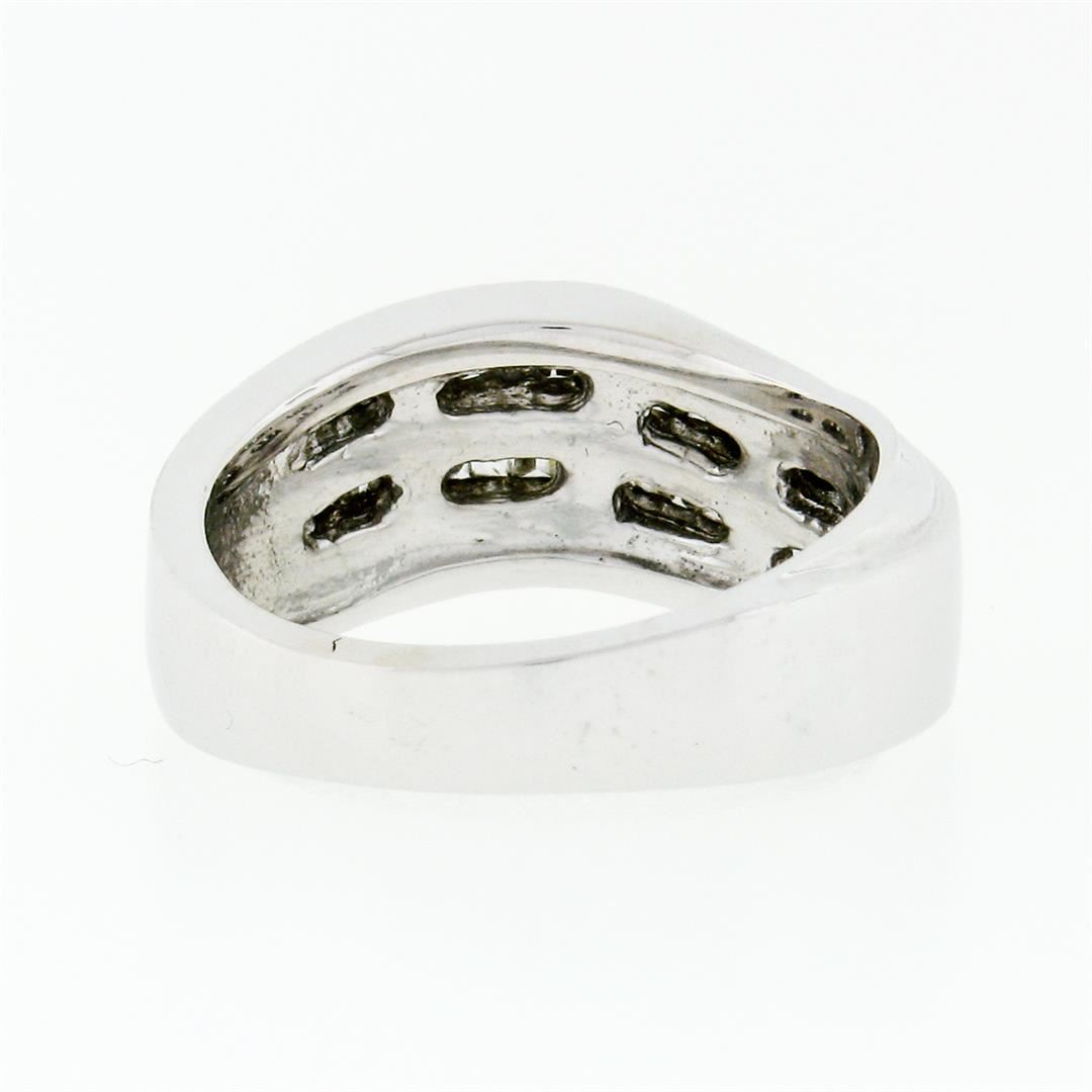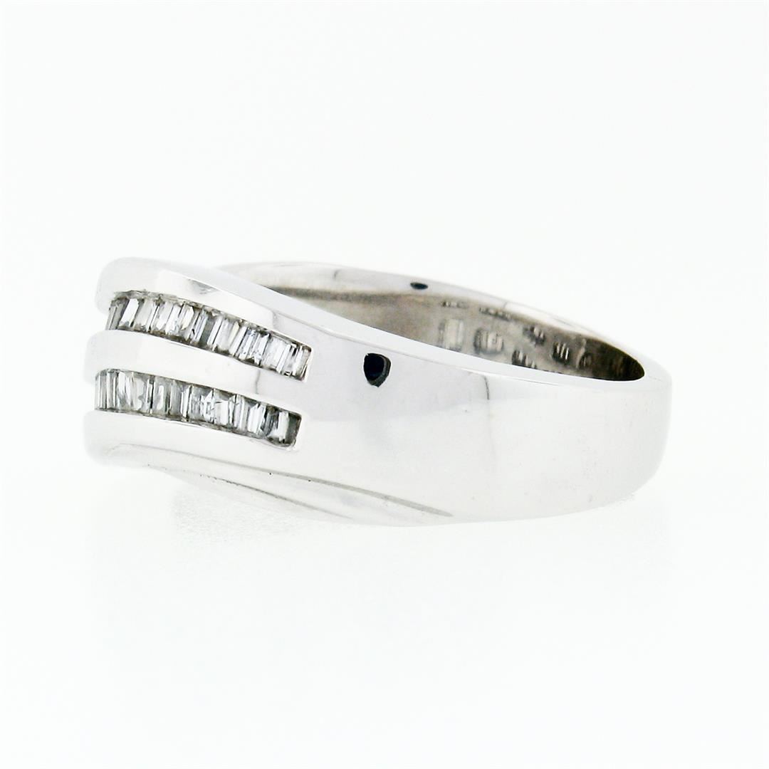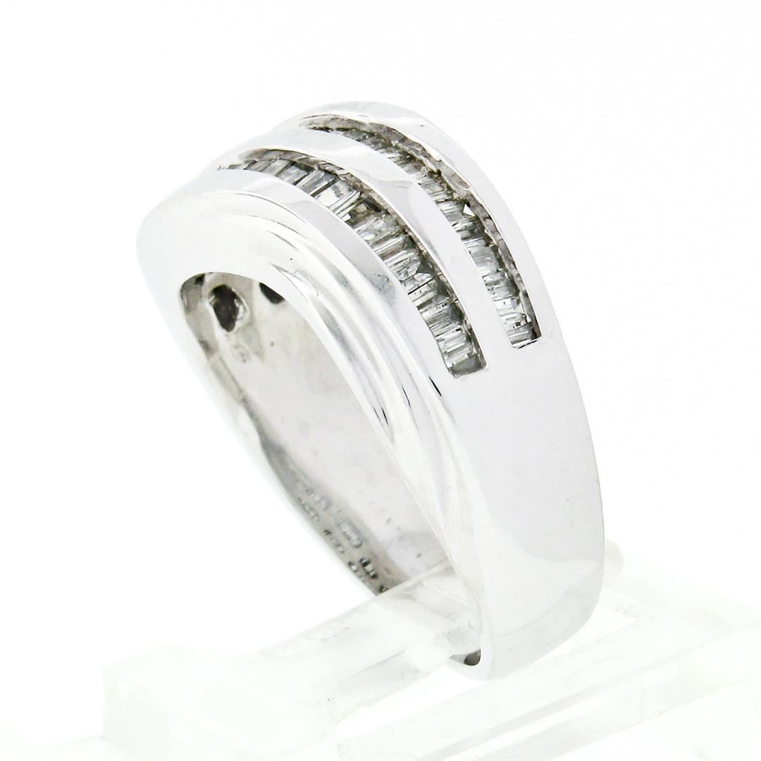 A solid 14k white gold wavy dual band ring with 48 tapered baguette cut natural diamonds (H/I - SI2/I1; 0.75ctw). The ring is size 7.0, weighs a total of 8.03 grams, and measures 8.33mm wide.