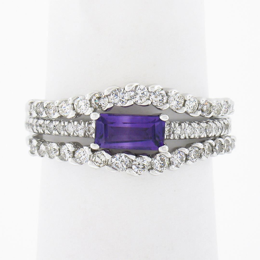A solid 14k white gold band ring set, with 1 emerald cut natural amethyst (), and 52 round brilliant cut natural diamonds (G/H - SI1/SI2 . 0.47ctw). The ring is size 5, weighs a total of 3.42 grams, and measures 8.4mm wide.