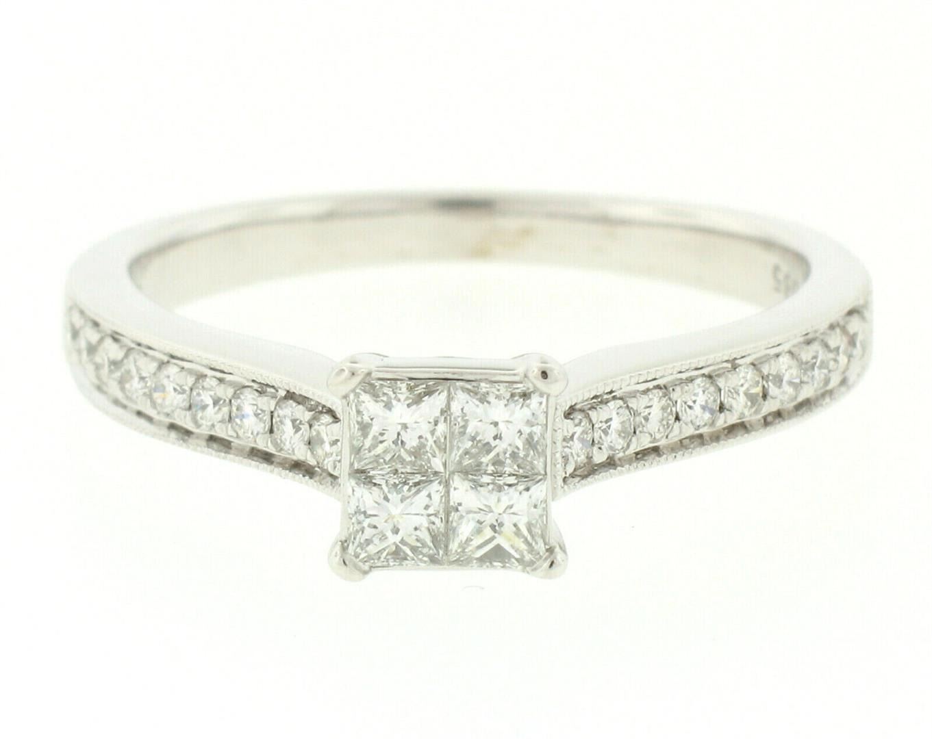 An estate solid 14k white gold engagement ring, with 4 princess cut natural diamonds (F/G- VS1/VS2; 0.48ctw), and 20 round brilliant cut natural diamonds (F/G- VS1/VS2; 0.31ctw). The ring is size 9.0, weighs a total of 4.00 grams, and measures 6.07mm wide.