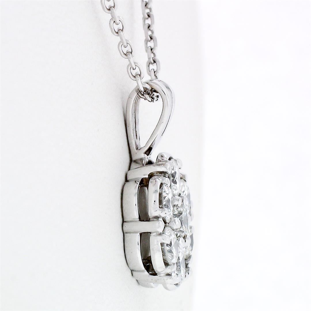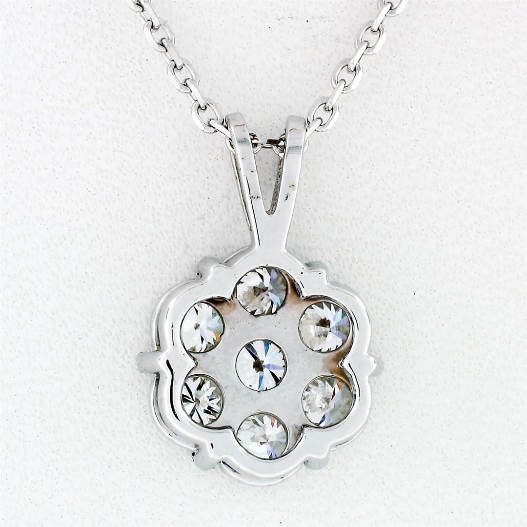 A solid 14k white gold flower pendant necklace with 7 round brilliant cut natural diamonds (G/H - VS1/VS2; 0.96ctw). 18 inch beveled cable link chain, 4.18 grams total weight, pendant measures 17.93x11.94mm.
