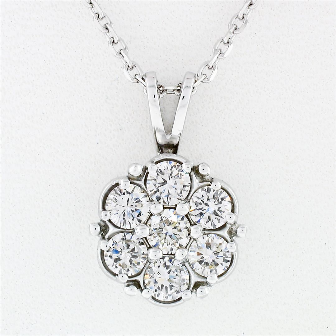 A solid 14k white gold flower pendant necklace with 7 round brilliant cut natural diamonds (G/H - VS1/VS2; 0.96ctw). 18 inch beveled cable link chain, 4.18 grams total weight, pendant measures 17.93x11.94mm.