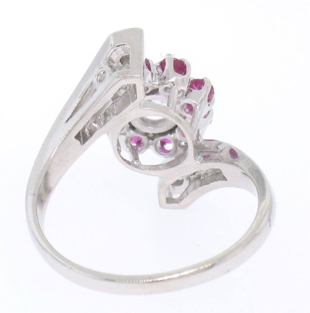 An estate solid 14k white gold offset cocktail ring, with 1 round brilliant cut natural diamond (G- VS1; 0.40ct), surrounded with a halo of 8 round cut natural rubbies (0.48ctw), and 6 single cut natural diamonds (G- VS1; 0.22ctw). The ring is size 6.5, weighs a total of 4.30 grams, and measures 10.54mm wide.