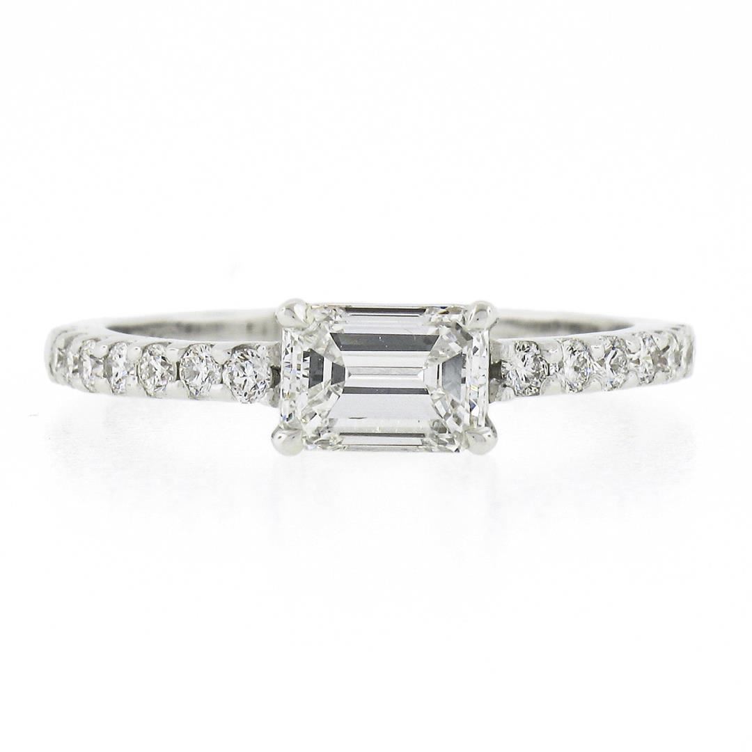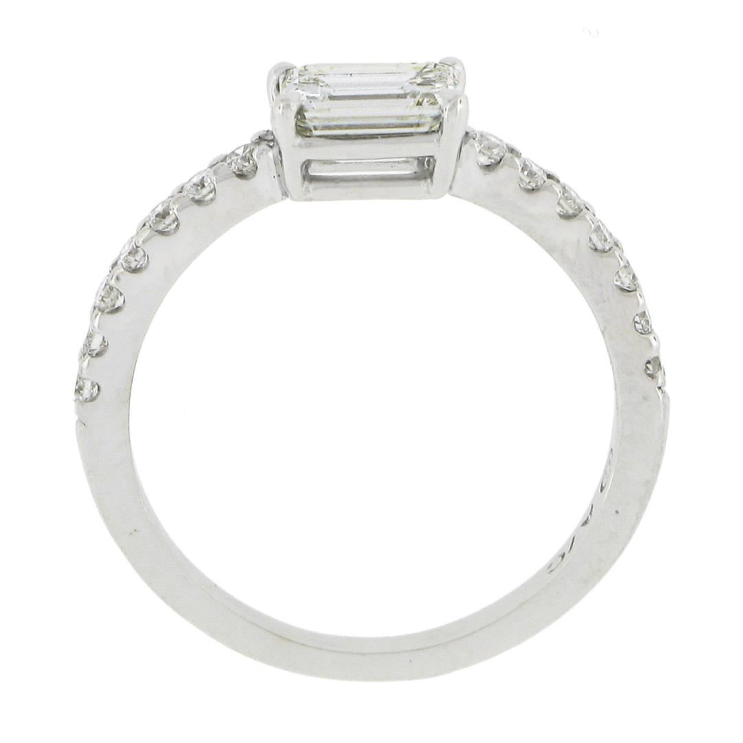 A new solid 14k white gold engagement ring, with 1 GIA graded emerald cut natural diamond (F - VS2 ; 0.91ct), accented with 14 round cut natural diamonds (F/G - VS1/VS2 ; 0.30ctw). The ring is size 7.5, weighs a total of 2.49 grams, and measures 5mm wide. Comes with all original relevant certifications.