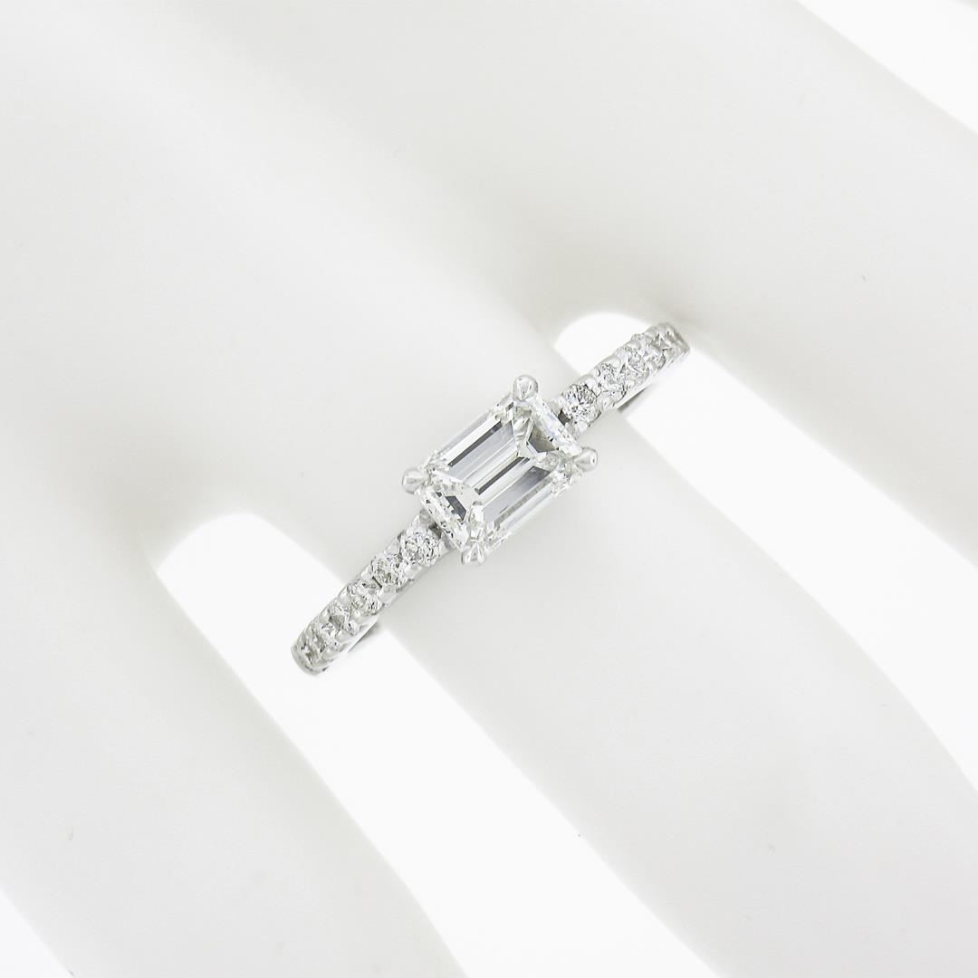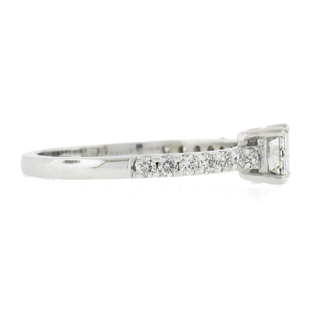 A new solid 14k white gold engagement ring, with 1 GIA graded emerald cut natural diamond (F - VS2 ; 0.91ct), accented with 14 round cut natural diamonds (F/G - VS1/VS2 ; 0.30ctw). The ring is size 7.5, weighs a total of 2.49 grams, and measures 5mm wide. Comes with all original relevant certifications.