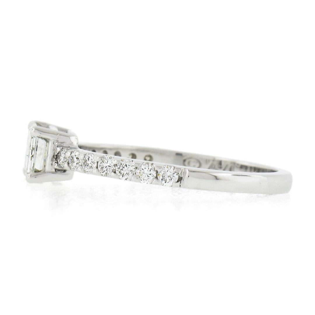 A new solid 14k white gold engagement ring, with 1 GIA graded emerald cut natural diamond (F - VS2 ; 0.91ct), accented with 14 round cut natural diamonds (F/G - VS1/VS2 ; 0.30ctw). The ring is size 7.5, weighs a total of 2.49 grams, and measures 5mm wide. Comes with all original relevant certifications.