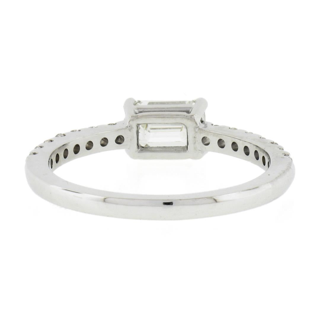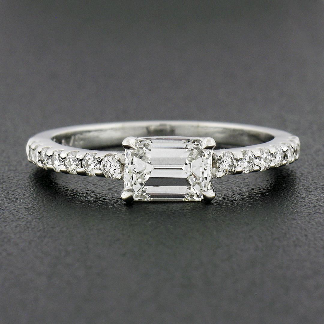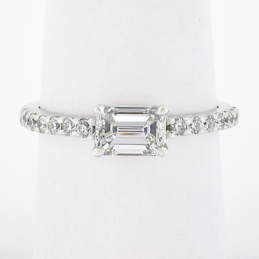 A new solid 14k white gold engagement ring, with 1 GIA graded emerald cut natural diamond (F - VS2 ; 0.91ct), accented with 14 round cut natural diamonds (F/G - VS1/VS2 ; 0.30ctw). The ring is size 7.5, weighs a total of 2.49 grams, and measures 5mm wide. Comes with all original relevant certifications.