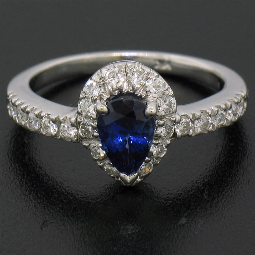 An estate solid 14k white gold solitaire ring, with 1 pear cut natural sapphire (0.93ct), and 23 round brilliant cut natural diamonds (F/G- VS1; 0.40ctw). The ring is size 5.5, weighs a total of 3.54 grams, and measures 10.36mm wide.