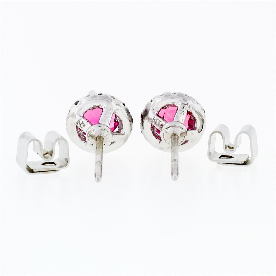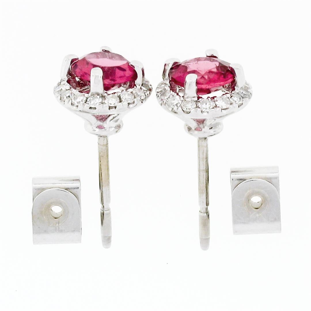 An estate solid 14k white gold stud halo earrings, with 2 round brilliant cut natural tourmaline (1.0ctw), and 32 round single cut natural diamonds (G/H- VS1/VS2 ; 0.35ctw). The earrings measure approximately 7.45mm in diameter and weigh a total of 1.92 grams.