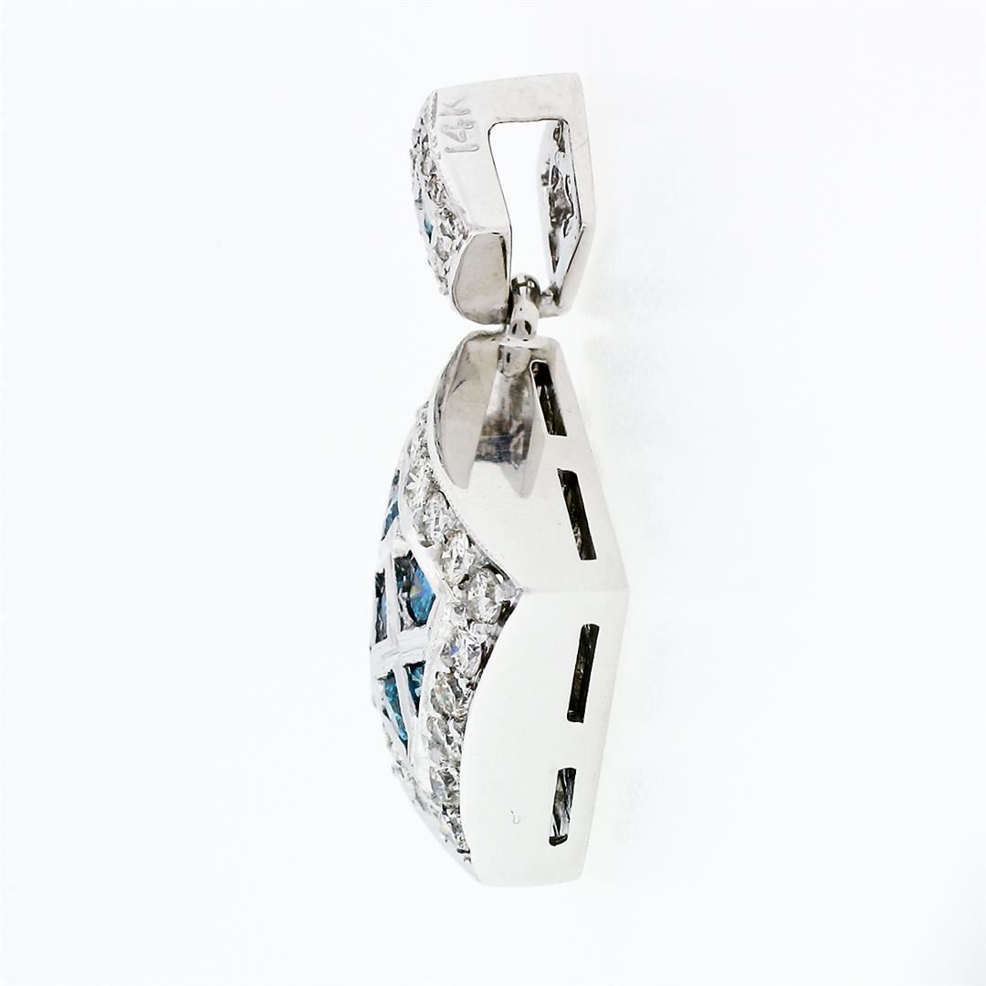 A solid 14k white gold square dangle pendant, with 8 round brilliant cut natural diamonds (Fancy Vivid Blue Color - VS1/VS2 ; 0.60ctw), and 34 round brilliant cut natural diamonds (F/G - VS1/VS2 ; 0.82ctw). The pendant weighs a total of 5.73 grams, measures 15.85x14.30mm including the bail, and the inside of the bail measures 5.2x2.2mm.