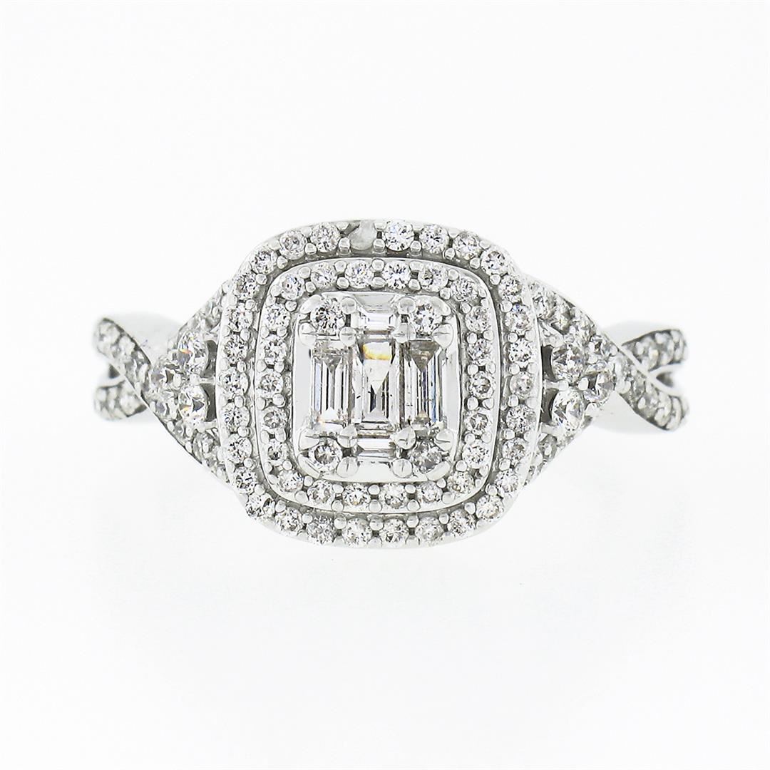 A solid 14k white gold engagement ring, with 102 round brilliant cut natural diamonds (G/H - SI1/I1 ; 1.20ct ), and 5 baguette cut natural diamonds (G/H - SI2/I1 ; 0.22ctw). The ring is size 4.5, weighs a total of 4.56 grams, and measures 10.90mm wide.