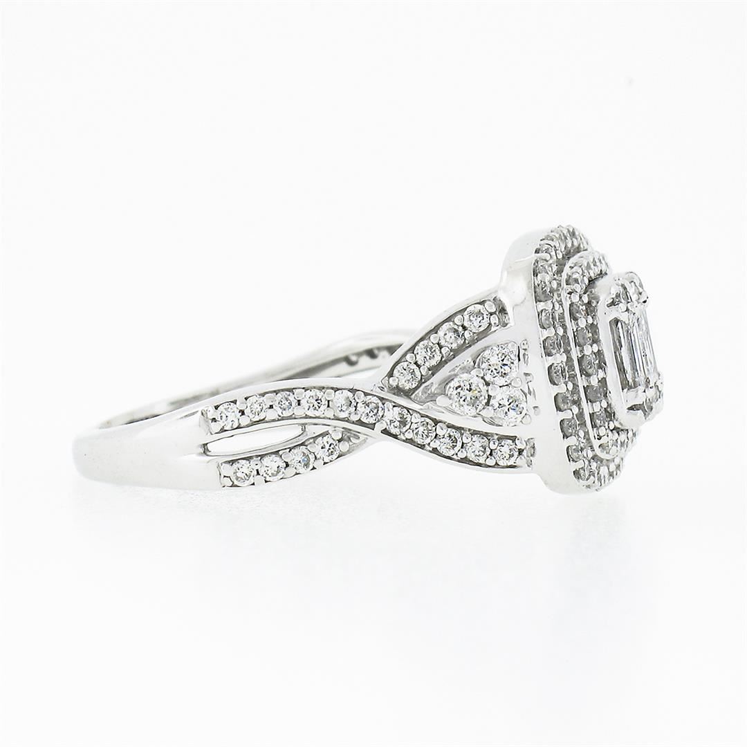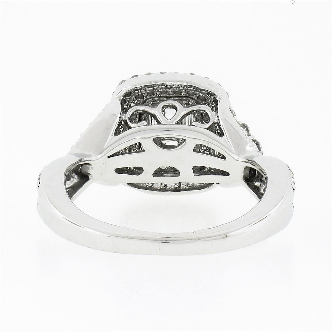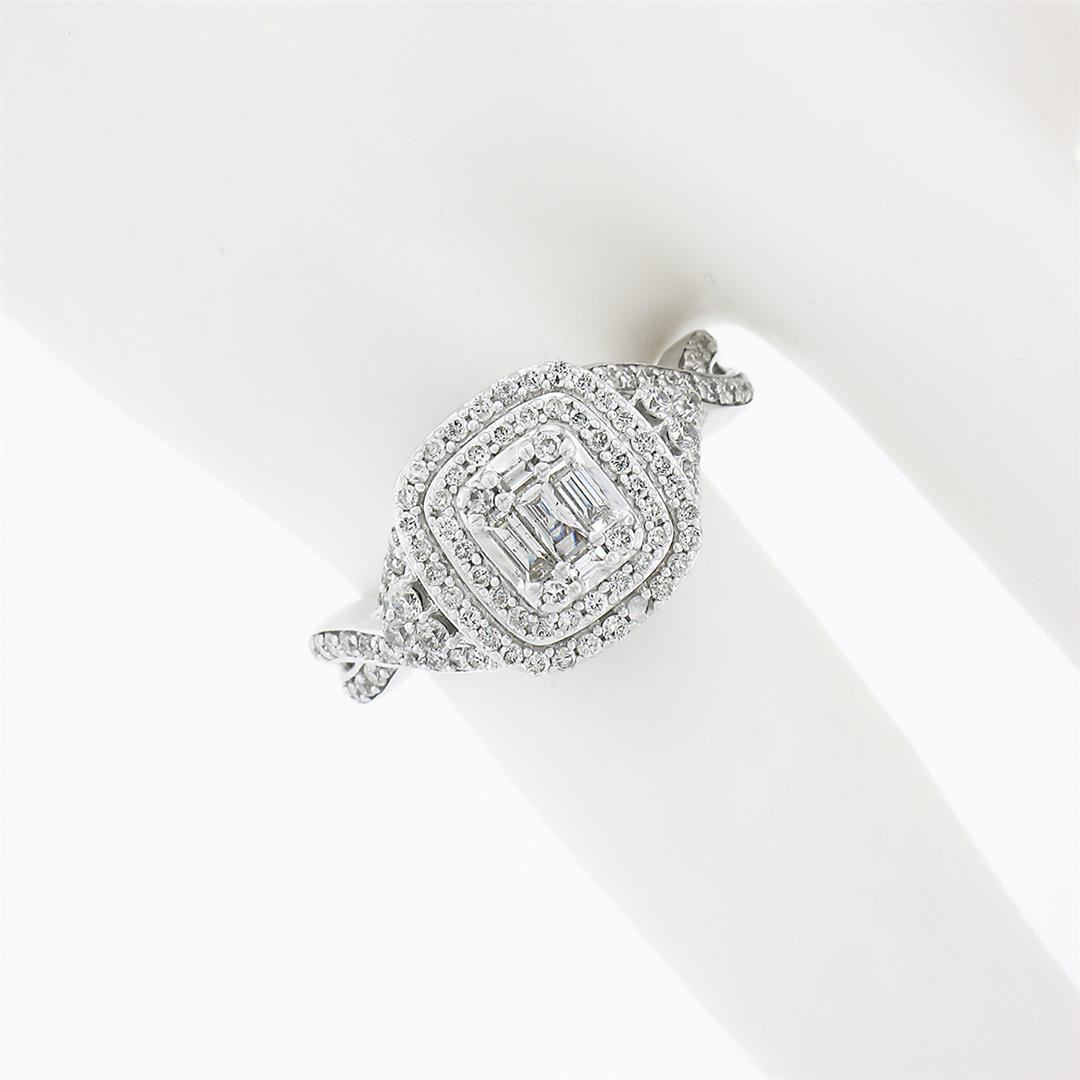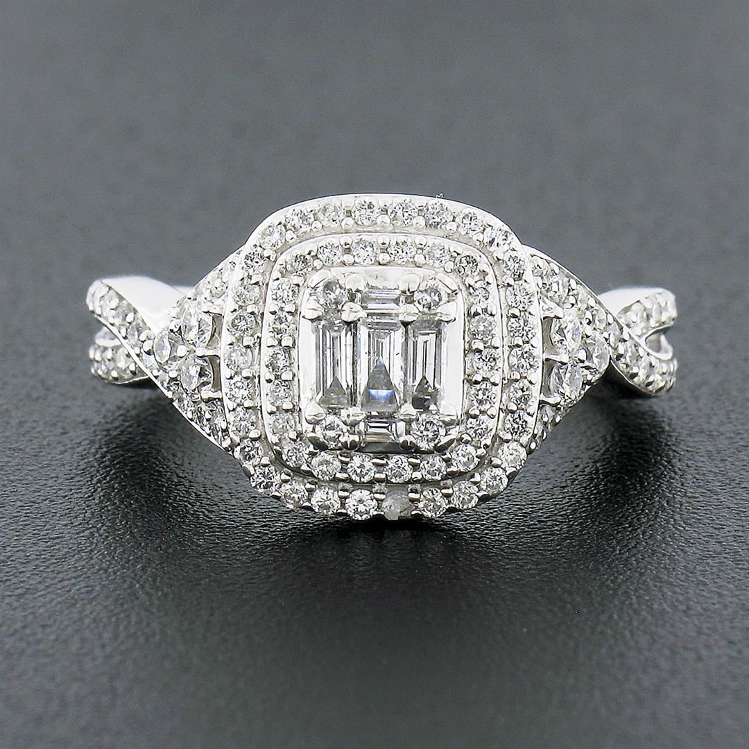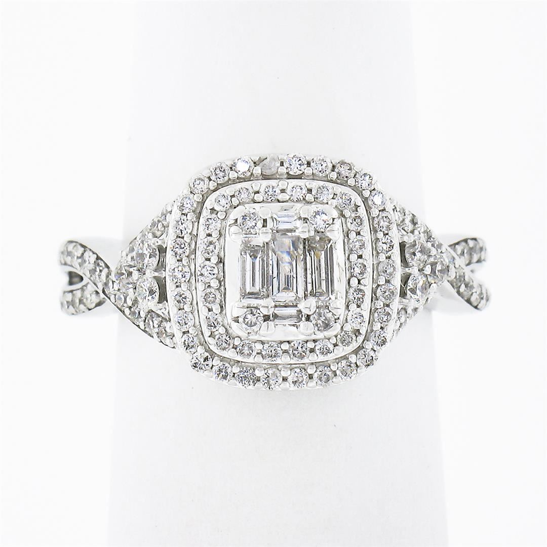 A solid 14k white gold engagement ring, with 102 round brilliant cut natural diamonds (G/H - SI1/I1 ; 1.20ct ), and 5 baguette cut natural diamonds (G/H - SI2/I1 ; 0.22ctw). The ring is size 4.5, weighs a total of 4.56 grams, and measures 10.90mm wide.